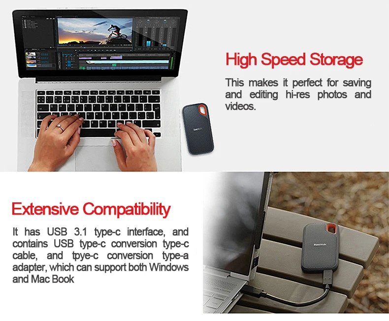 Diseñado para funcionar tanto con Windows como con Mac, el SanDisk Extreme Portable SSD está equipado con un conector USB 3,1 tipo C y también incluye un cable USB tipo C a tipo C y un adaptador tipo C a tipo A, lo que significa que funcionará con los Macs de hoy, mañana y ayer.