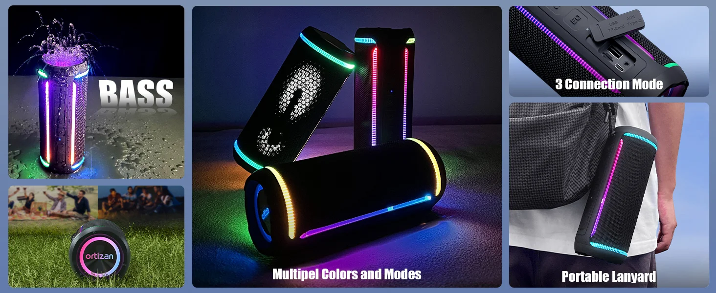 Altavoz Bluetooth portátil Ortizan, parlantes inalámbricos para exteriores, sonido alto de 40 W y graves profundos, resistencia al agua IPX7, estéreo inalámbrico verdadero, Bluetooth 5.3, luces intermitentes coloridas, ecualizador preestablecido, reproducción USB, para playa, barco, piscina, camping, bicicleta, ducha, Regalos para hombres