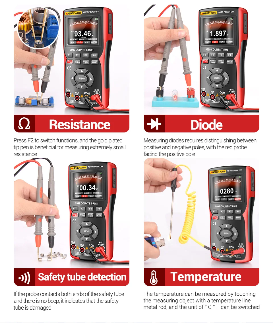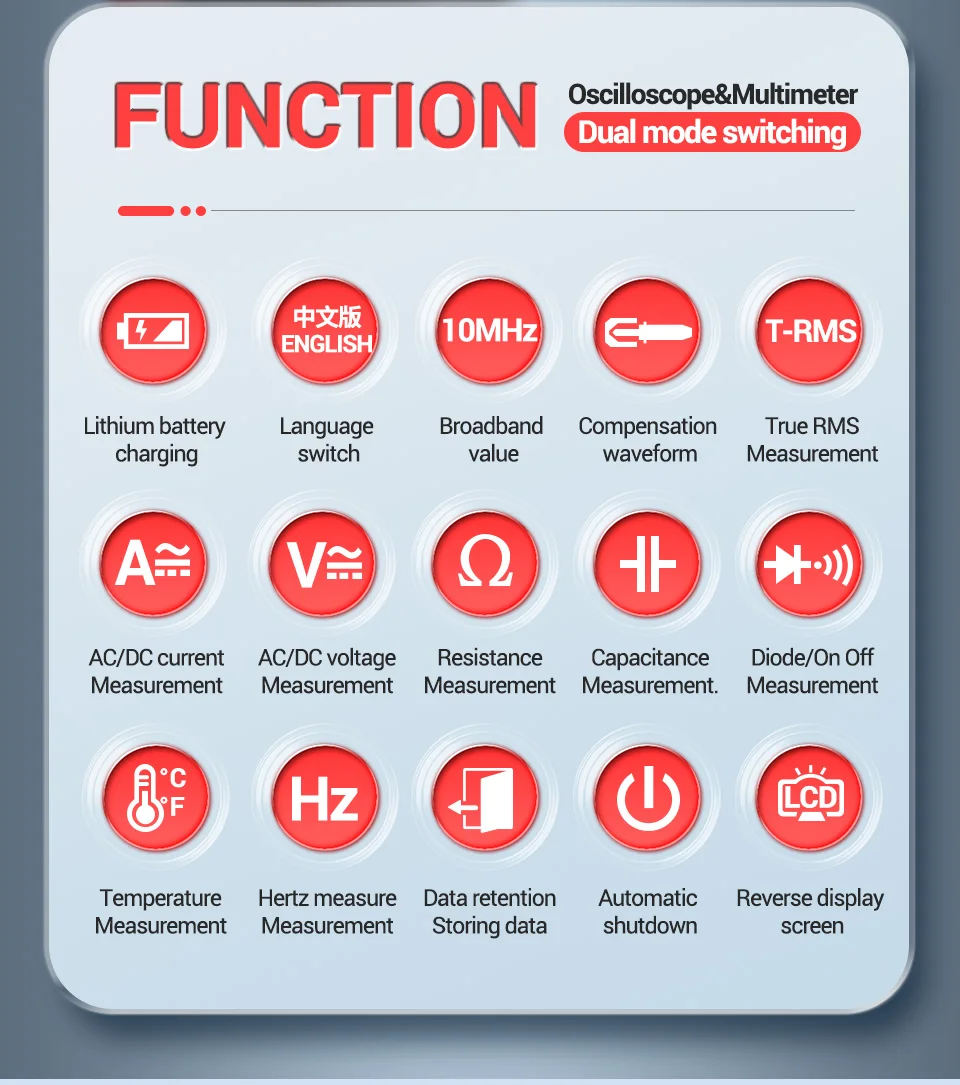 El multímetro osciloscopio portátil adopta tecnología de moldeo por doble inyección, con un diseño de apariencia hermosa, tamaño pequeño, fácil de transportar y operación flexible;La interfaz del menú del botón de función es clara e intuitiva, la pantalla adopta 2.Pantalla a color IPS de visión completa de 8 pulgadas y el multímetro tiene 9999 recuentos;El producto combina la función de osciloscopio y multímetro como uno solo, con un rendimiento superior y funciones potentes, y se puede utilizar en varios escenarios de medición para satisfacer más necesidades de medición de los usuarios.