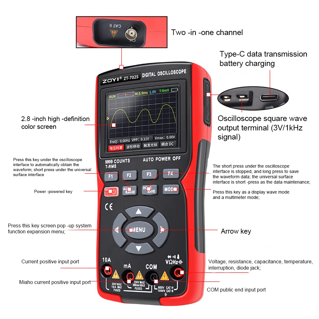 Pantalla a color: el osciloscopio está diseñado con pantalla a color de 2,8 pulgadas con retroiluminación, que es fácil para nosotros leer los datos.