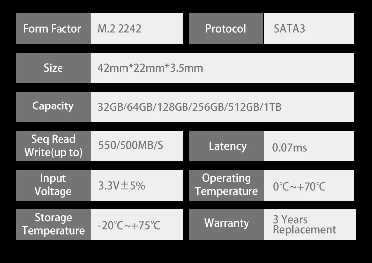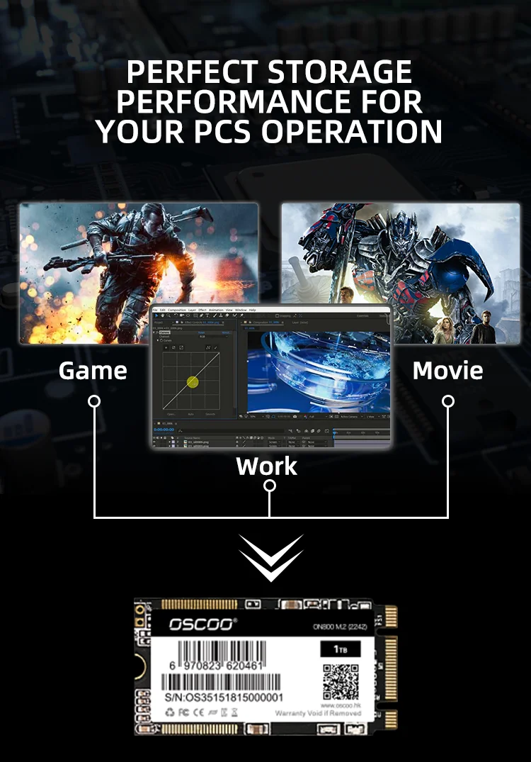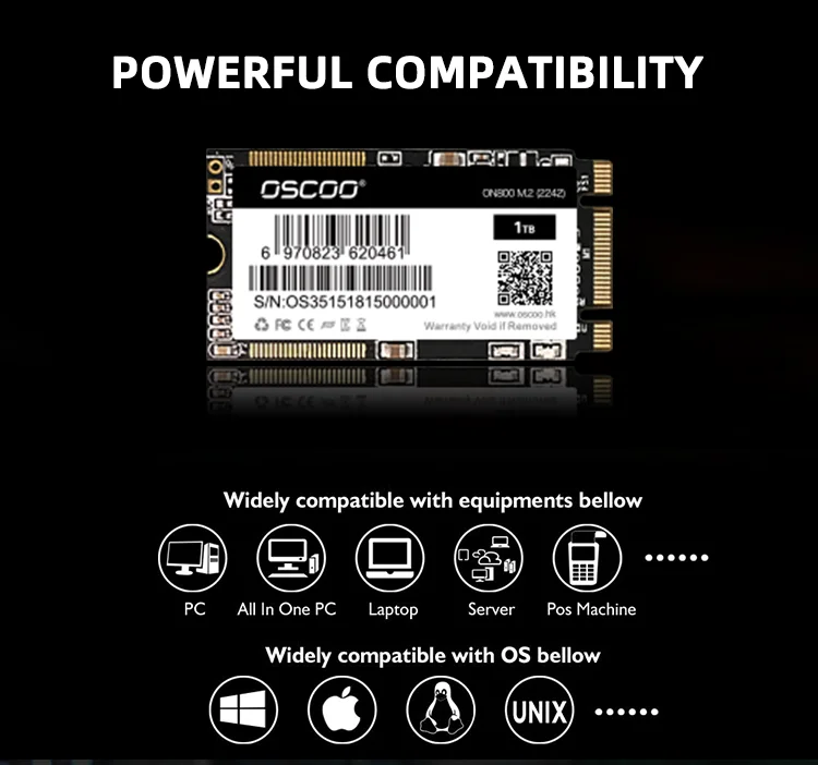 OSCOO se dedica a proporcionar soluciones de almacenamiento confiables y eficientes.El SSD SATA M.2 2242 está diseñado para durar, lo que garantiza que sus datos permanezcan seguros y accesibles cuando los necesite.