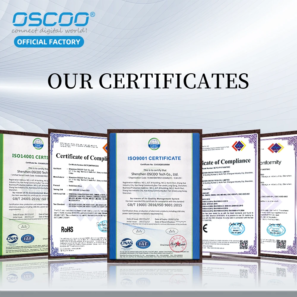Shenzhen OSCOO Tech Co., Limited fue fundada en 2004, especializada en SSD (unidades de estado sólido), DDR (DDR3 y DDR4), unidades flash USB y otros periféricos de computadora.Nuestra fábrica es una empresa nacional de alta tecnología con certificación ISO 9001:2008 y 14001:2014.