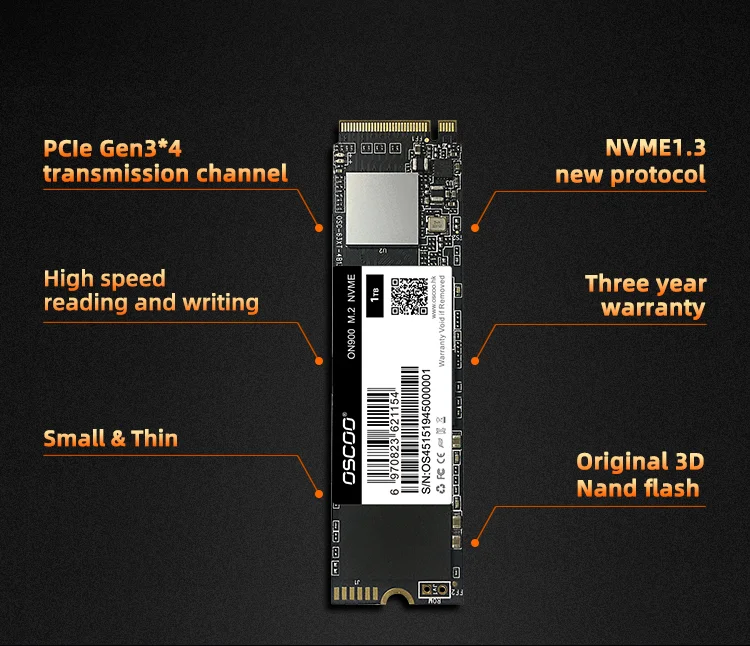 OSCOO PCIe NVMe M.2 2280 SSD M2 Disco Duro Gen3x4 Disco Duro Interno de Estado Sólido de Súper Alta Velocidad para Ordenador Portátil Netbook Ultrabook Descripción Protocolo de interfaz: M2 NVME PCIe SSD Conjunto de chips: 3D TLC Nand Flash Voltaje de entrada: DC 5V (± 5%) Tipo de interfaz: PCIe 3.0X4 Temperatura de funcionamiento: 0 ~ 70 ℃ Temperatura de almacenamiento: -45 ~ 85 ℃ Dimensión: 22mm * 80mm * 3,5mm Resistencia de Escritura: escribir 100GB/día, teóricamente puede usar 8 años Leer vida: ilimitado MTBF: 1.000.000 horas Capacidad de soporte: 128GB, 256GB, 512GB, 1TB Soporte de función: TRIM, NCQ y S.M.A.R.T Sistema de soporte: Ventanas 11. Windows 10. Windows 8,1. Windows 8.Windows7,Mac Ox,Limux