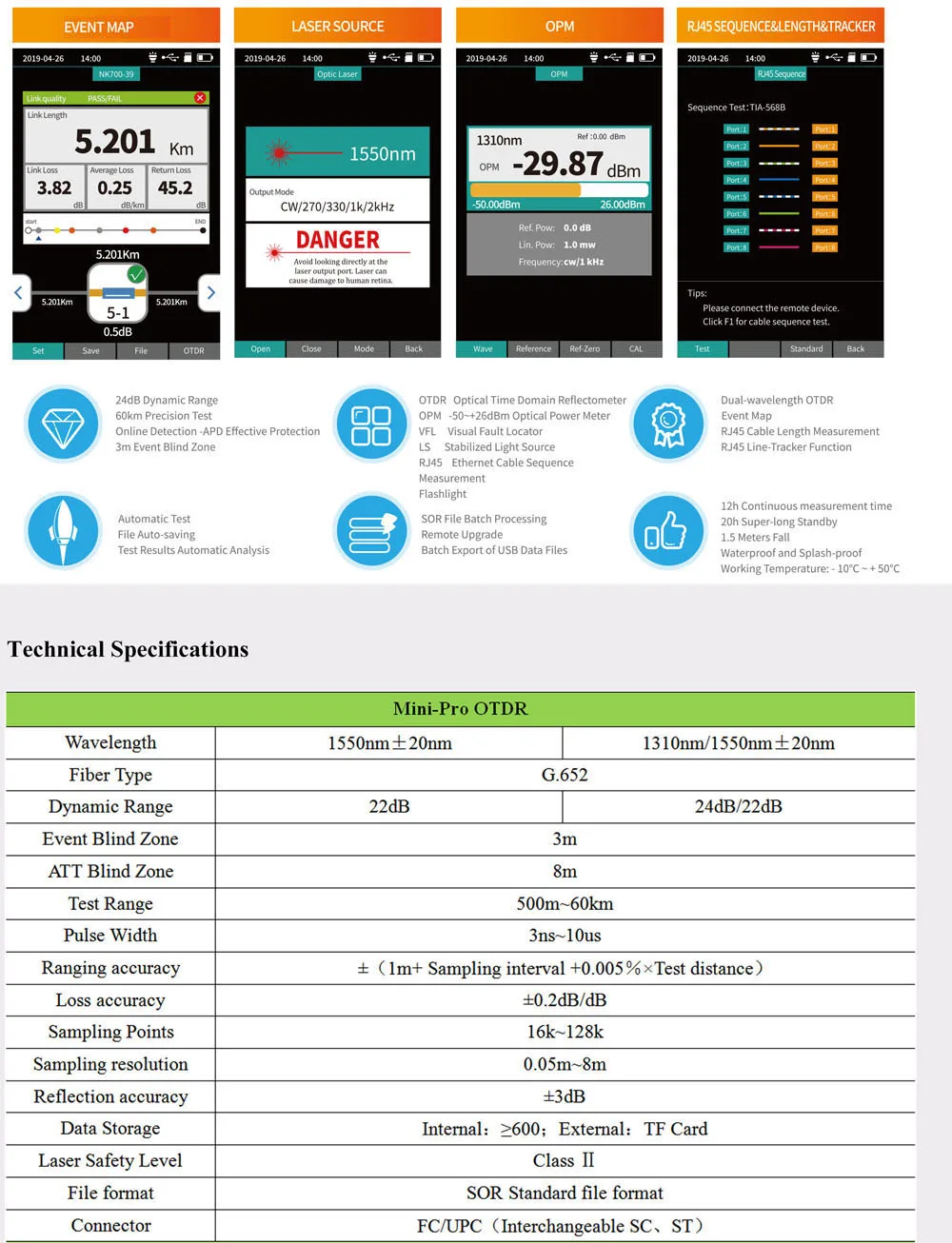 Comprar OTDR Mini Pro-menú ruso de alta precisión, reflectómetro de dominio de tiempo óptico, fibra óptica, y 1550nm 1310nm, FC SC