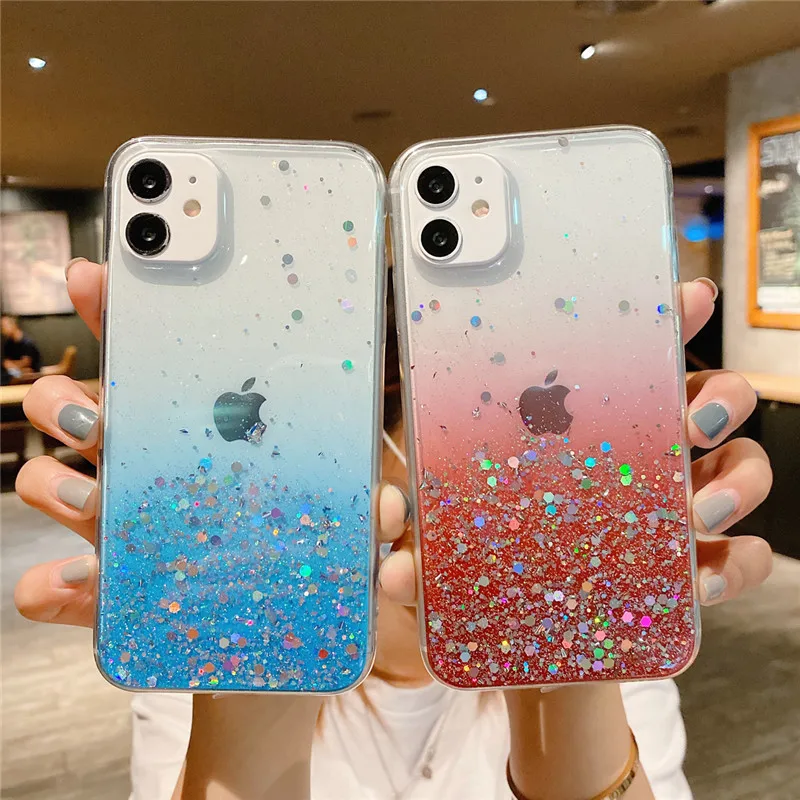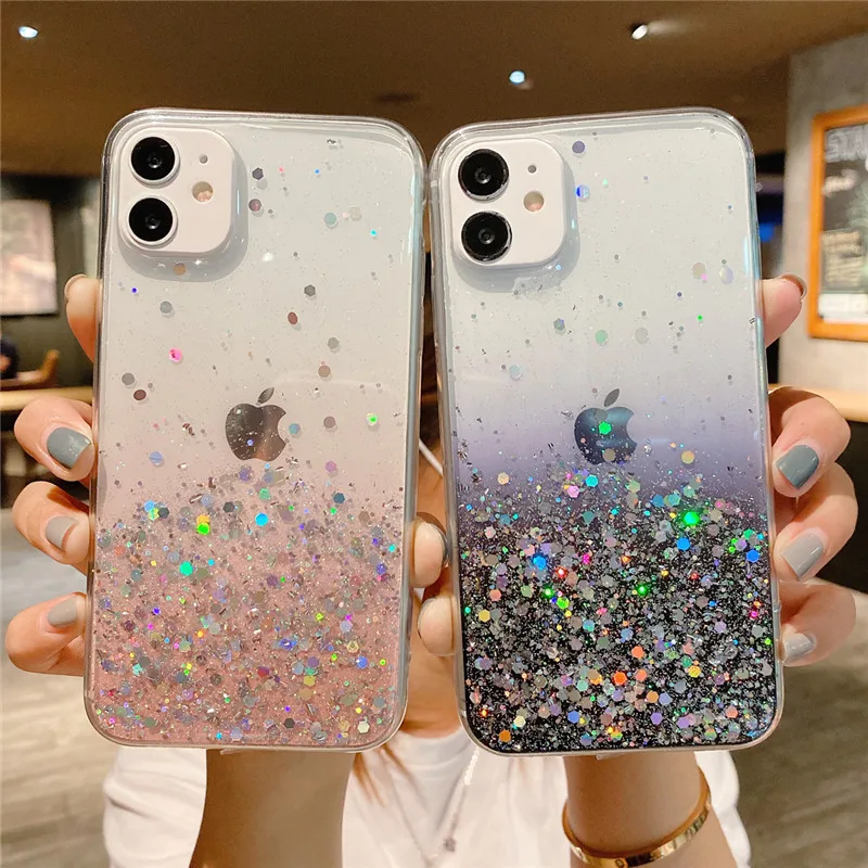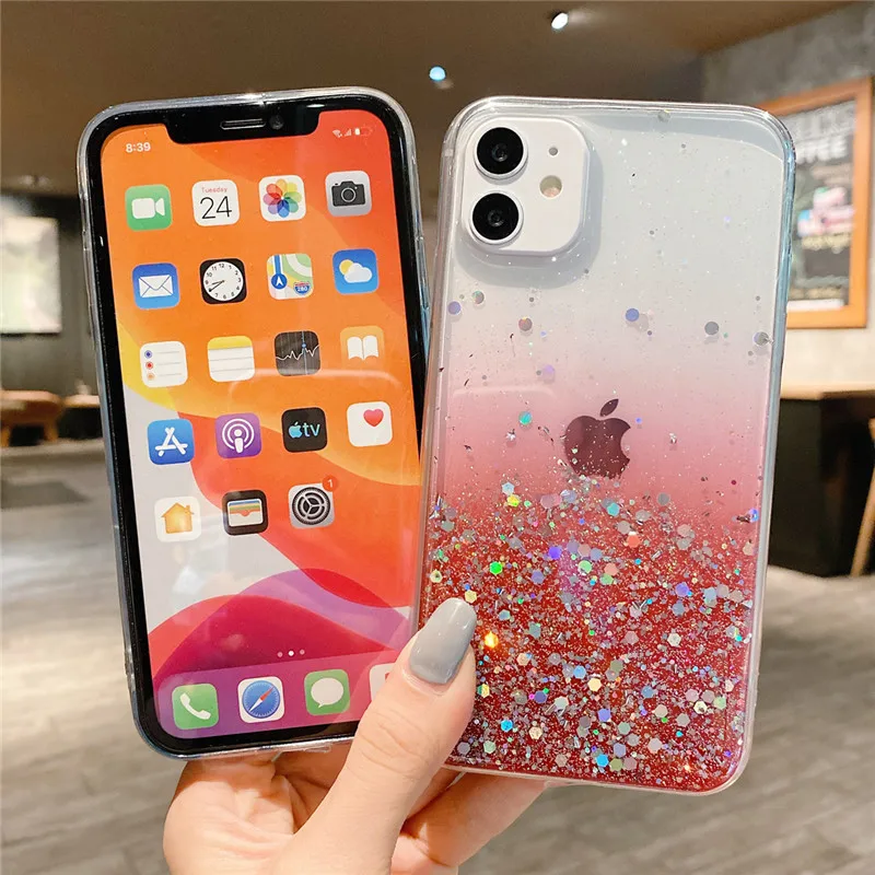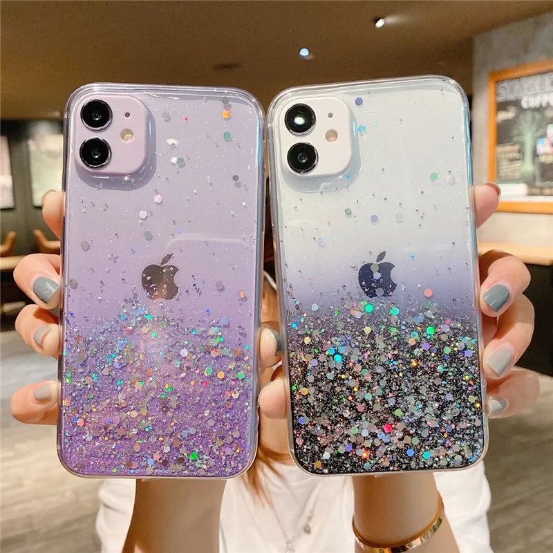 Comprar Ottwn-funda de teléfono transparente con purpurina para iPhone, carcasa trasera suave de lujo para modelos 14, 11, 12, 13 Pro Max, XS, X, XR, 7, 8 Plus, SE 2020