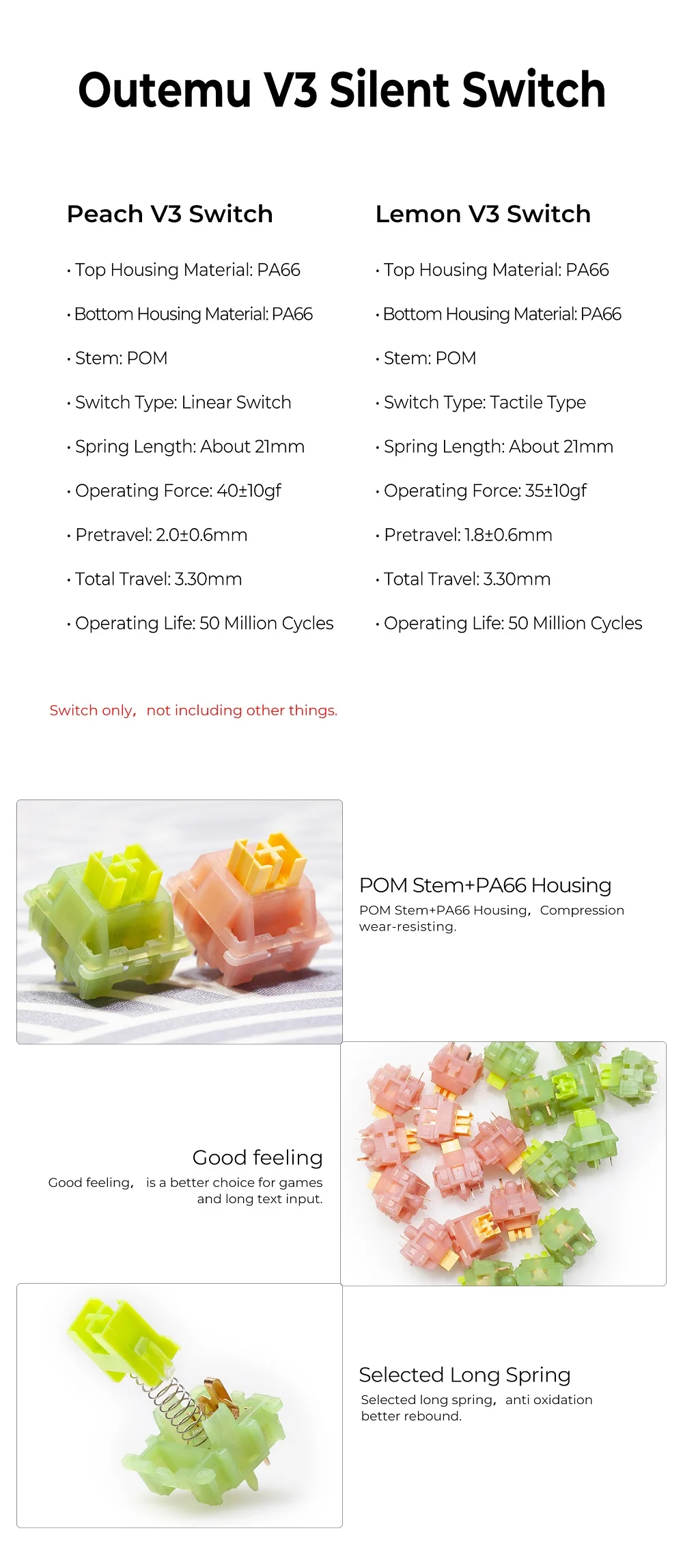 Los interruptores son excelentes. Lamentablemente, no es compatible (ni siquiera al quitar los pasadores de plástico) con los Outemus que ya tengo. Los probaré en un teclado nuevo cuando llegue.