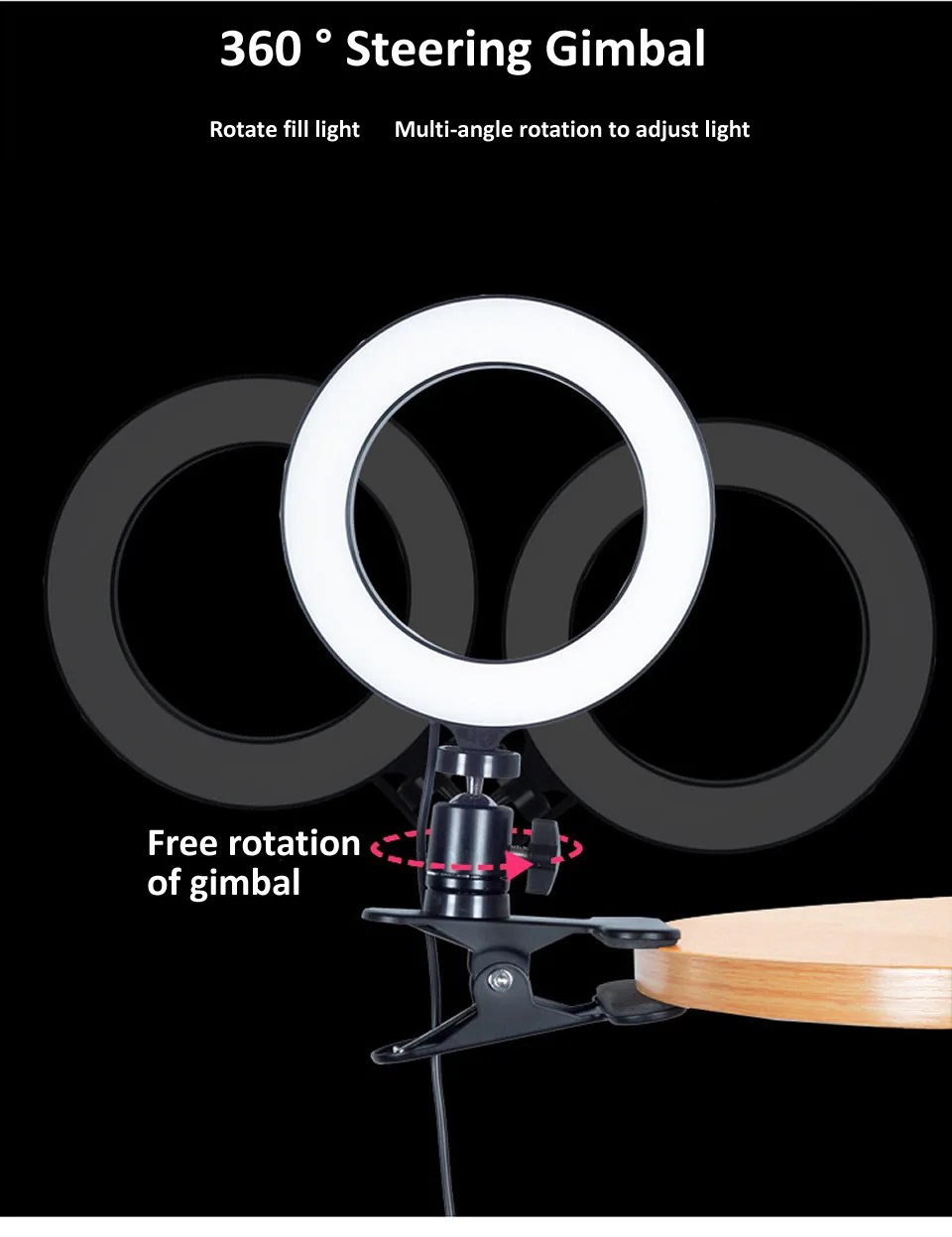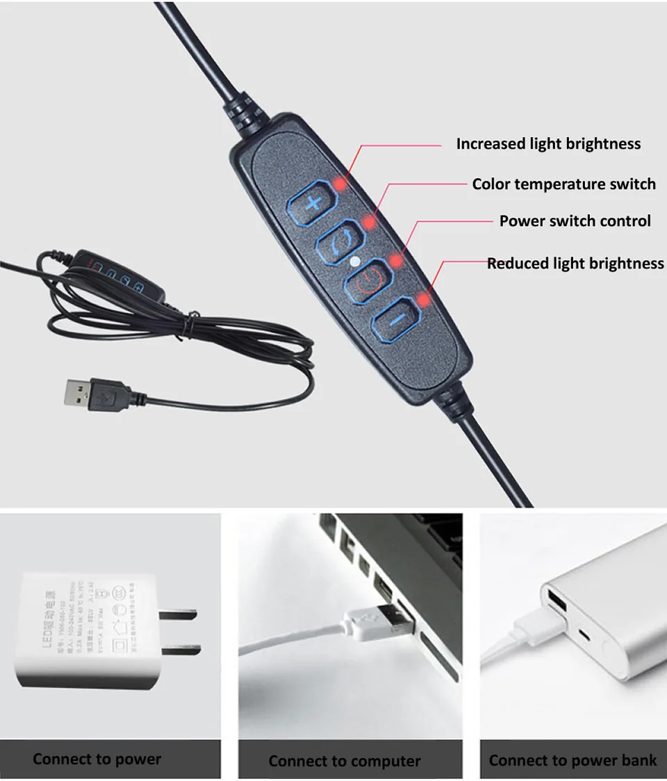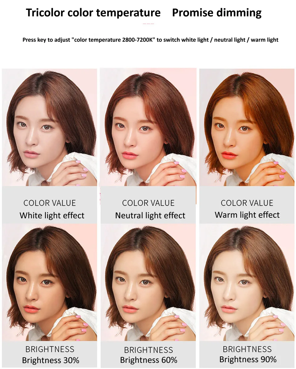 Nombre: Luz de relleno de belleza en vivoConector: interfaz USB universalIluminación: luz cálida, luz neutra, luz blancaLongitud del cable: alarga 2 metros de cableTemperatura de Color: 2800K-7200KBase: base de clipUsos: relleno de luz, cara delgada, belleza, piel brillanteRotación: Rotación de 360 ° PTZDescripción:Anillo de luz LED regulable con un amplio rango de atenuación desde el nivel 1 hasta el nivel 10.Diseño LED especial, ligero y portátil. Unidad de corriente constante, baja pérdida de energía.Sin radiación de luz ultravioleta e infrarroja, baja salida de calor, seguridad y protección del medio ambiente.Larga vida útil de más de horas.Con brazo flexible reforzado que se moverá libremente y nunca se caerá.Cable Extra largo y tornillos de pulgar resistentes.Se aplica ampliamente a la luz de fotos al aire libre, luz de relleno en interiores, Retrato, moda, arte de boda, fotografía publicitaria, grabación de video, etc.Usuario: Blogger de vídeo, Red de Influencers, maquillador, fotógrafo, mujer, niño, etc.El paquete incluye