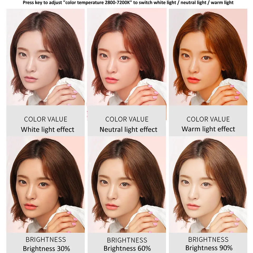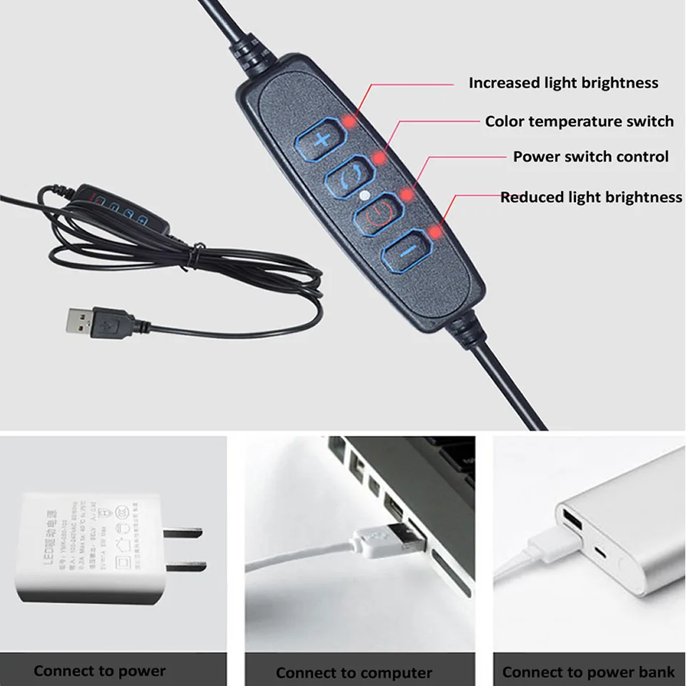 Nombre: Luz de relleno de belleza en vivoConector: interfaz USB universalIluminación: luz cálida, luz neutra, luz blancaLongitud del cable: alarga 2 metros de cableTemperatura de Color: 2800K-7200KBase: base de clipUsos: relleno de luz, cara delgada, belleza, piel brillanteRotación: Rotación de 360 ° PTZDescripción:Anillo de luz LED regulable con un amplio rango de atenuación desde el nivel 1 hasta el nivel 10.Diseño LED especial, ligero y portátil. Unidad de corriente constante, baja pérdida de energía.Sin radiación de luz ultravioleta e infrarroja, baja salida de calor, seguridad y protección del medio ambiente.Larga vida útil de más de horas.Con brazo flexible reforzado que se moverá libremente y nunca se caerá.Cable Extra largo y tornillos de pulgar resistentes.Se aplica ampliamente a la luz de fotos al aire libre, luz de relleno en interiores, Retrato, moda, arte de boda, fotografía publicitaria, grabación de video, etc.Usuario: Blogger de vídeo, Red de Influencers, maquillador, fotógrafo, mujer, niño, etc.El paquete incluye