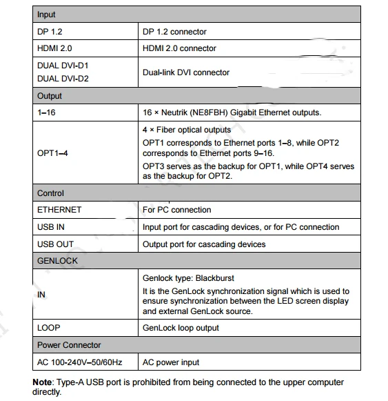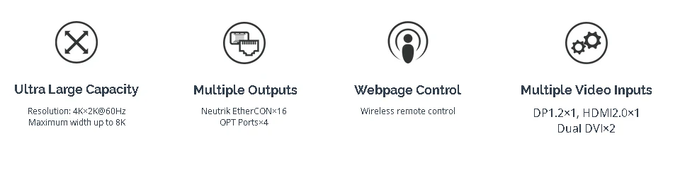 Entrada: DP1.2, HDMI2.0, DVI dual x 2 Salida: Neutrik EtherCON x 16/Puertos OPT x 4 Control de página web Cerradura de fuente de alimentación confiable CE, ROHS, FCC, UL, EAC Respaldo automático flexible Modo de transmisión independiente