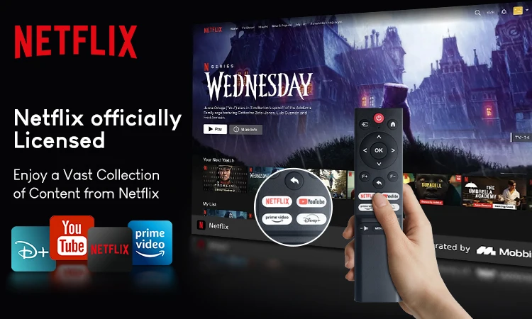 Este dispositivo tiene la licencia oficial de Netflix, lo que permite a los usuarios disfrutar de una amplia colección de contenido de Netflix.También proporciona fácil acceso a otras plataformas como YouTube, Disney+ y Prime Video a través de un control remoto con botones de acceso directo dedicados.