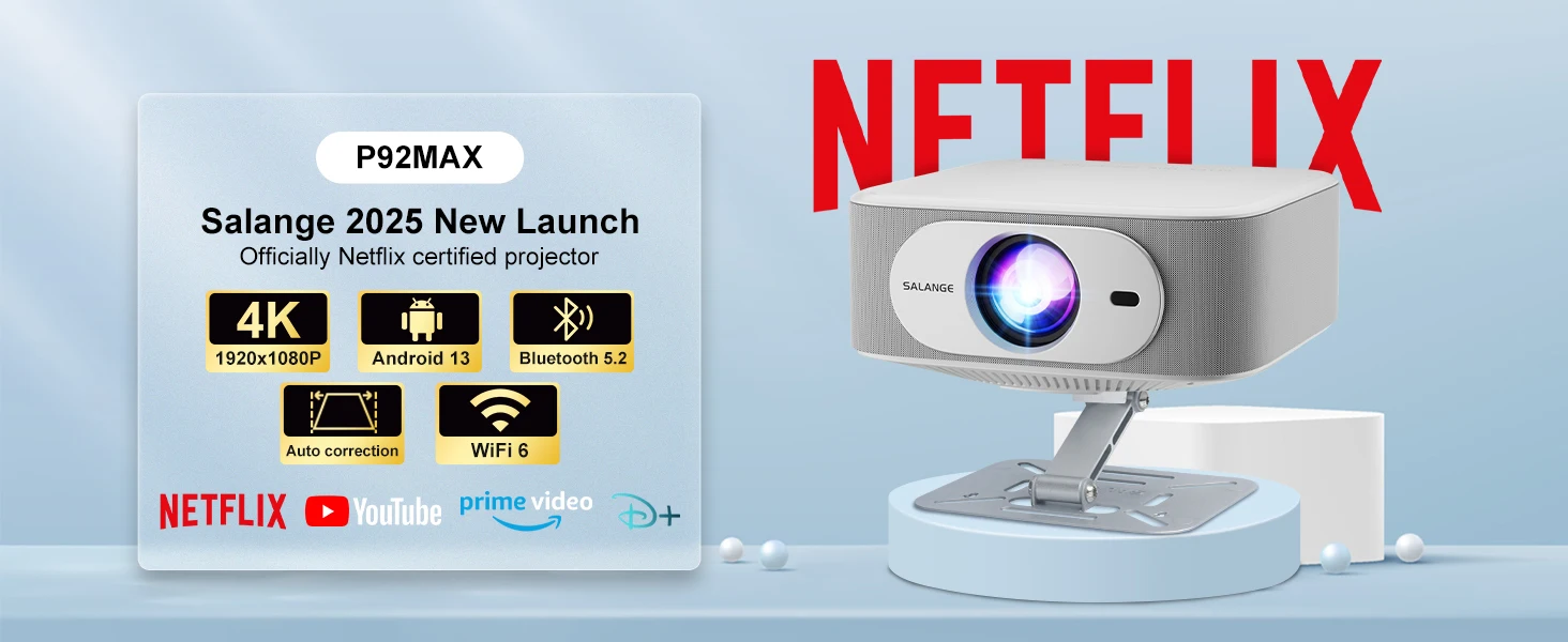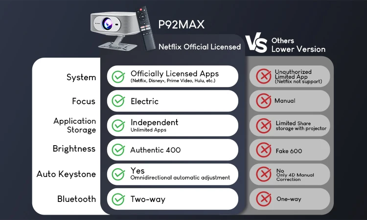 El P92MAX con licencia de Netflix supera los proyectores de versión más baja, con aplicaciones con licencia oficial (Netflix, Disney+, etc.), enfoque eléctrico, almacenamiento independiente para aplicaciones ilimitadas, brillo auténtico de 400, corrección trapezoidal omnidireccional y Bluetooth bidireccional.