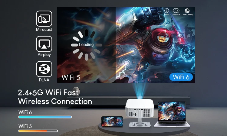 Este proyector cuenta con Wi-Fi 6 2.4+5G para una conexión inalámbrica rápida, compatible con Miracast, Airplay y ADN.En comparación con Wi-Fi 5, proporciona mayor velocidad, mayor estabilidad y menor latencia, lo que lo hace perfecto para una transmisión y juegos fluidos al conectar dispositivos como teléfonos y computadoras portátiles.