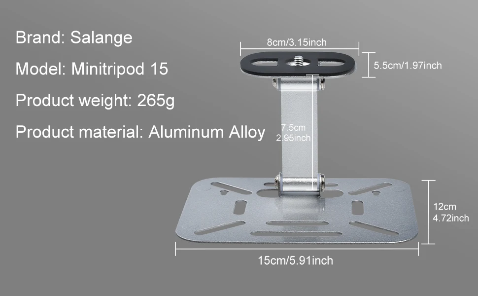 El Salange Minitripod elaborado con aleación de aluminio, pesa solo 265 g para facilitar su transporte.Presenta un diseño compacto con dimensiones (por ejemplo, base de 15 cm) y una estructura ajustable, que proporciona un soporte estable a la vez que es liviano y duradero, perfecto para una configuración conveniente.