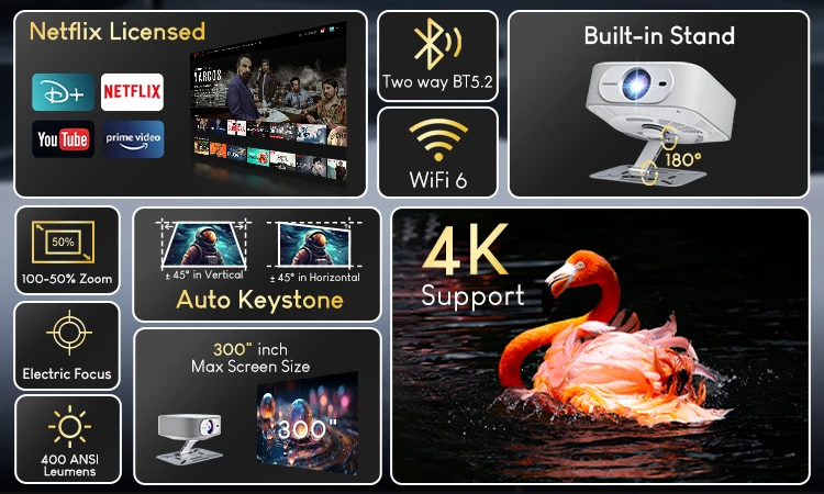 Este proyector tiene la licencia de Netflix y es compatible con Disney+, YouTube y más.Tiene BT5.2 bidireccional, Wi-Fi 6, a 180° soporte incorporado, zoom de 100 - 50%, ±45° corrección trapezoidal automática, enfoque eléctrico, 400 lúmenes ANSI, soporte 4K y una pantalla de máximo 300".