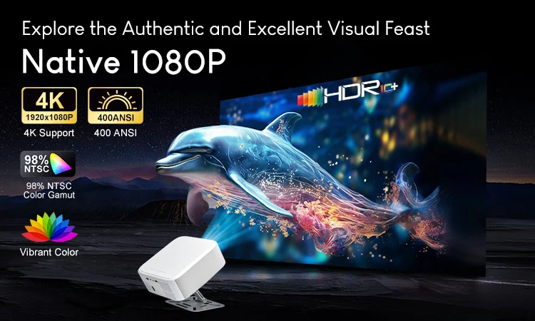 Este proyector ofrece un proceso visual auténtico y excelente, con resolución nativa de 1080P, soporte 4K, brillo de 400 lúmenes ANSI, una gama de colores NTSC del 98%, HDR10+ y colores vibrantes.