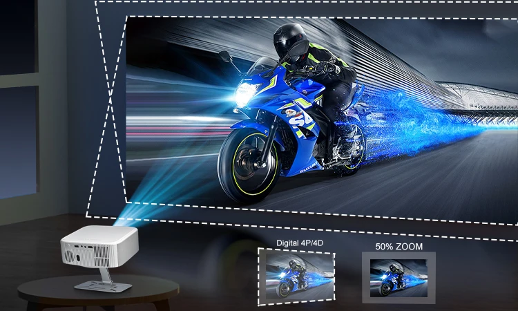 Este proyector cuenta con prácticas capacidades de ajuste de pantalla: corrección trapezoidal vertical automática, enfoque eléctrico, zoom del 100% al 50% y corrección digital 4P/4D, lo que permite una configuración sencilla para proyecciones nítidas y correctamente alineadas.