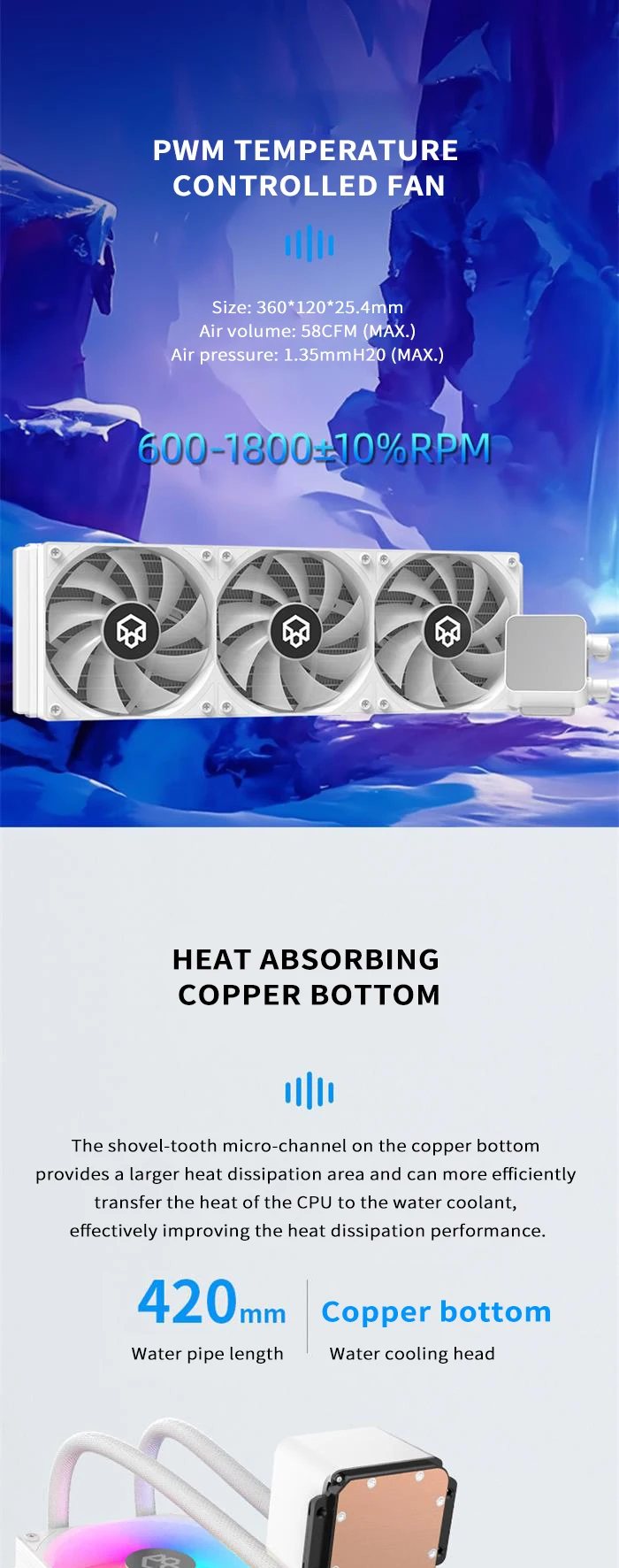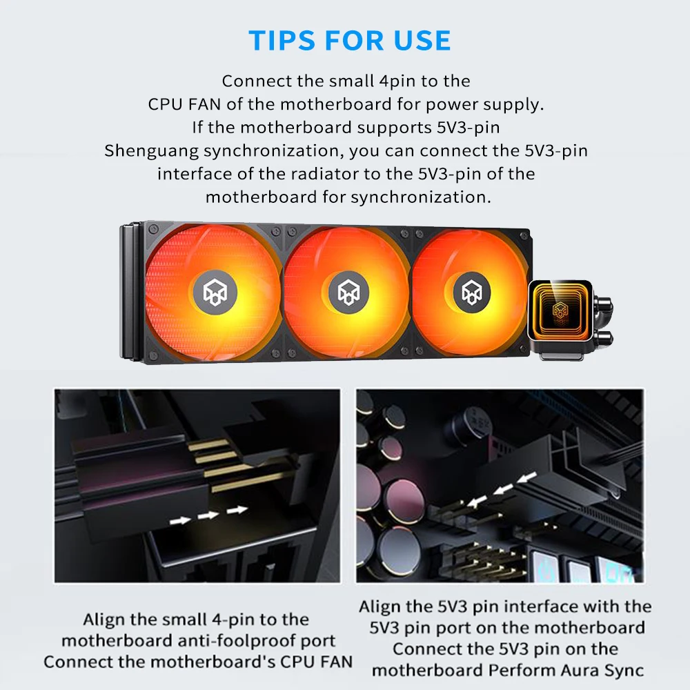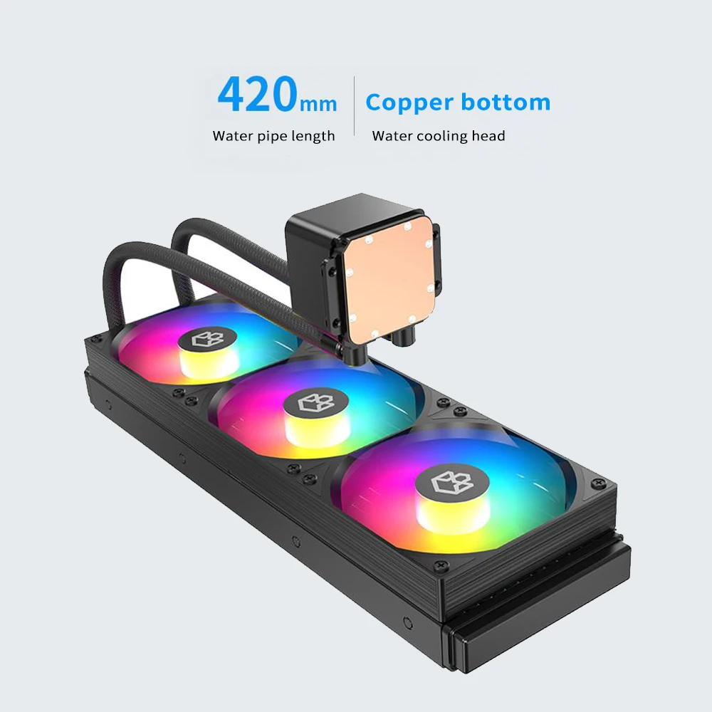 Enfriador de agua Aigo|Enfriador de agua Aigo 360 mm|Radiador de refrigeración por agua integrado: Cuenta con un radiador de refrigeración por agua integrado, lo que garantiza una solución de refrigeración perfecta para su CPU.