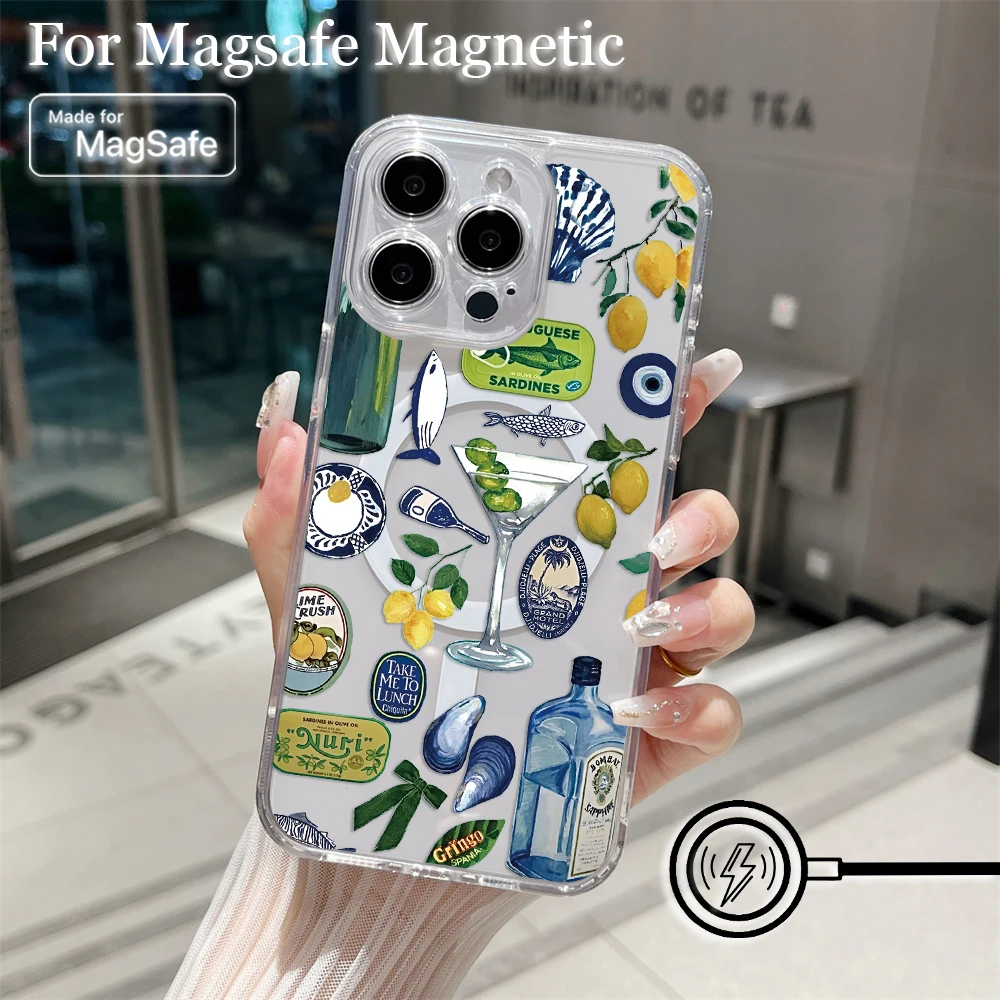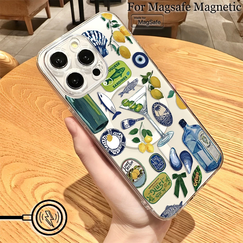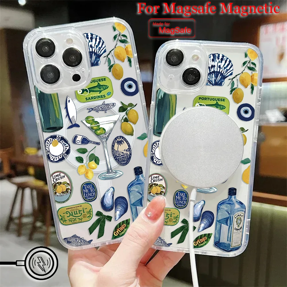 Comprar Paisaje costero vino limón Magsafe funda de teléfono magnético para iPhone 16 15 14 13 12 11 8 7 Plus Pro Max X XR XSMax cubierta transparente de Tpu