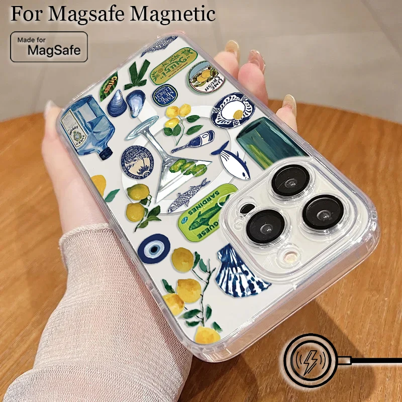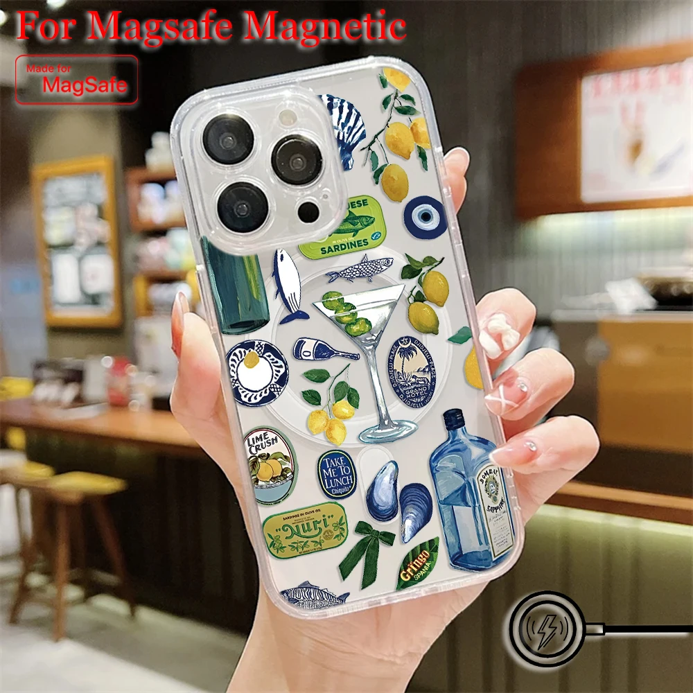 Comprar Paisaje costero vino limón Magsafe funda de teléfono magnético para iPhone 16 15 14 13 12 11 8 7 Plus Pro Max X XR XSMax cubierta transparente de Tpu