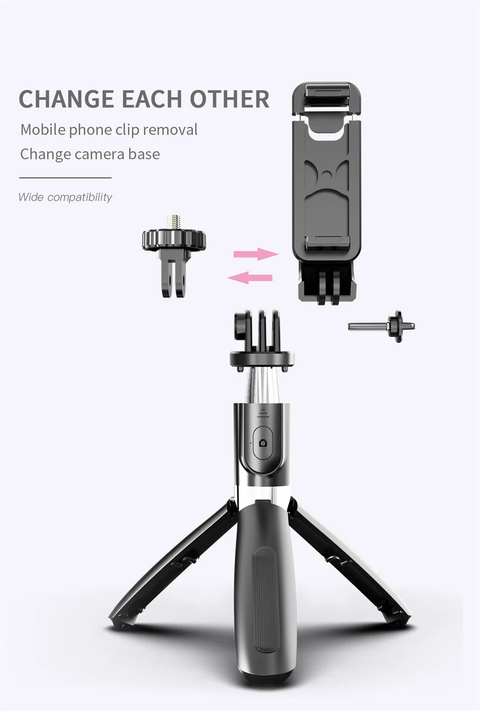 1: Diseño innovador y compatible, entrega estándar 1/4 accesorios, teléfonos móviles, Cámaras Deportivas se pueden usar fácilmente