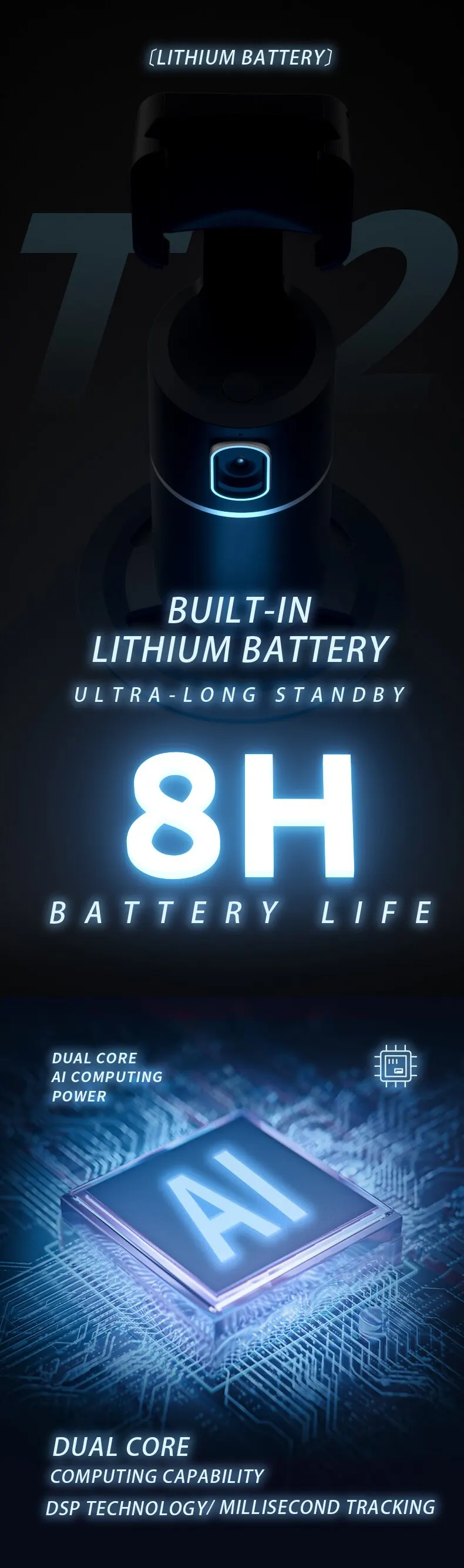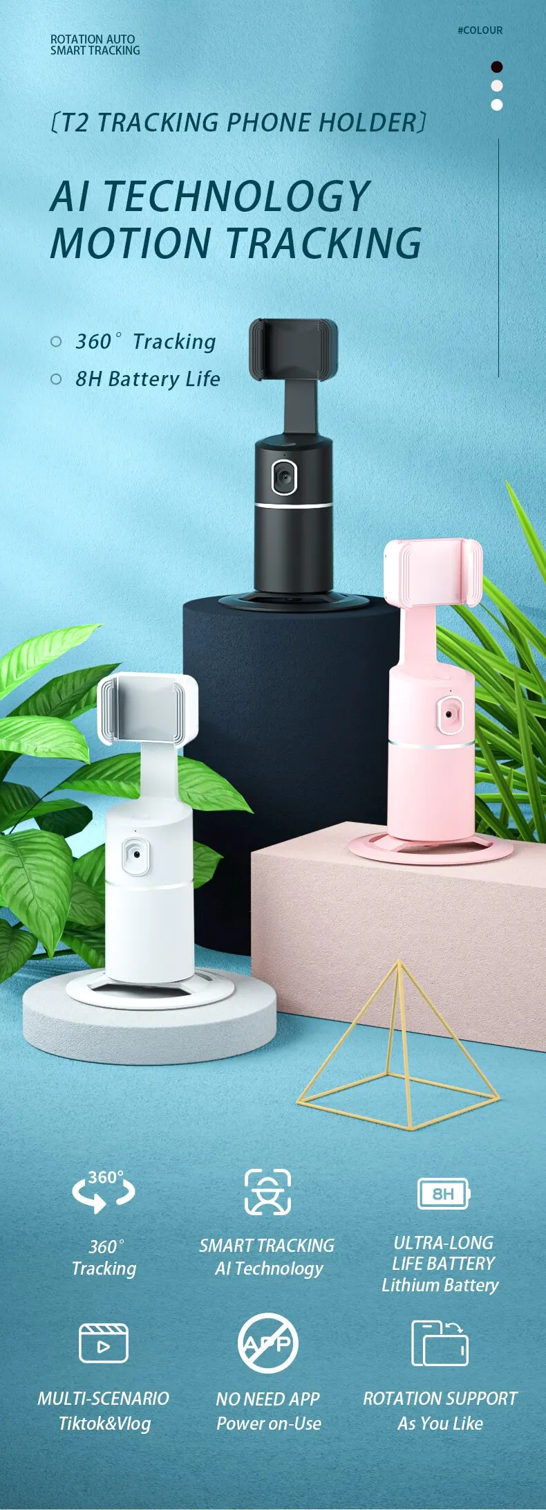 T2 TSelfie Stick Soporte de seguimiento facial automático de rotación de 360 grados