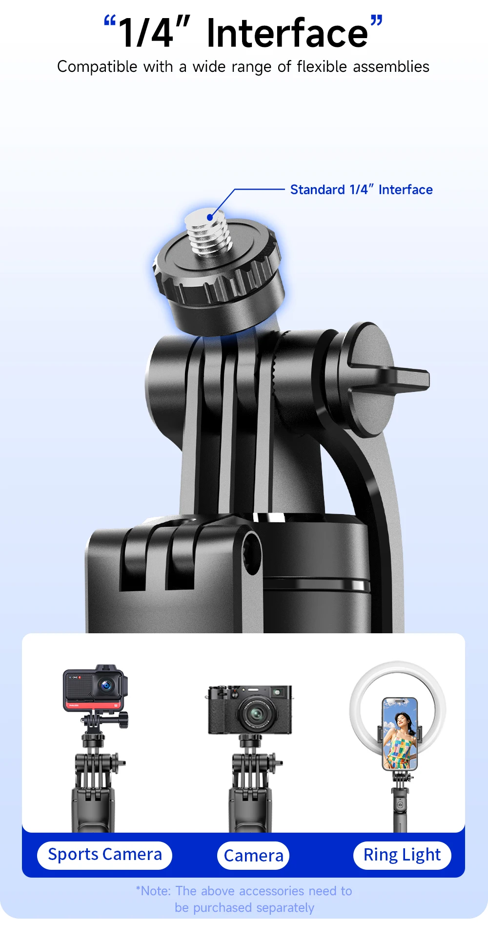 4.Interfaz de 1/4 de pulgada para una amplia compatibilidad (admite modificadores de luz, luces duales, cámaras de acción, cámaras digitales, etc.);