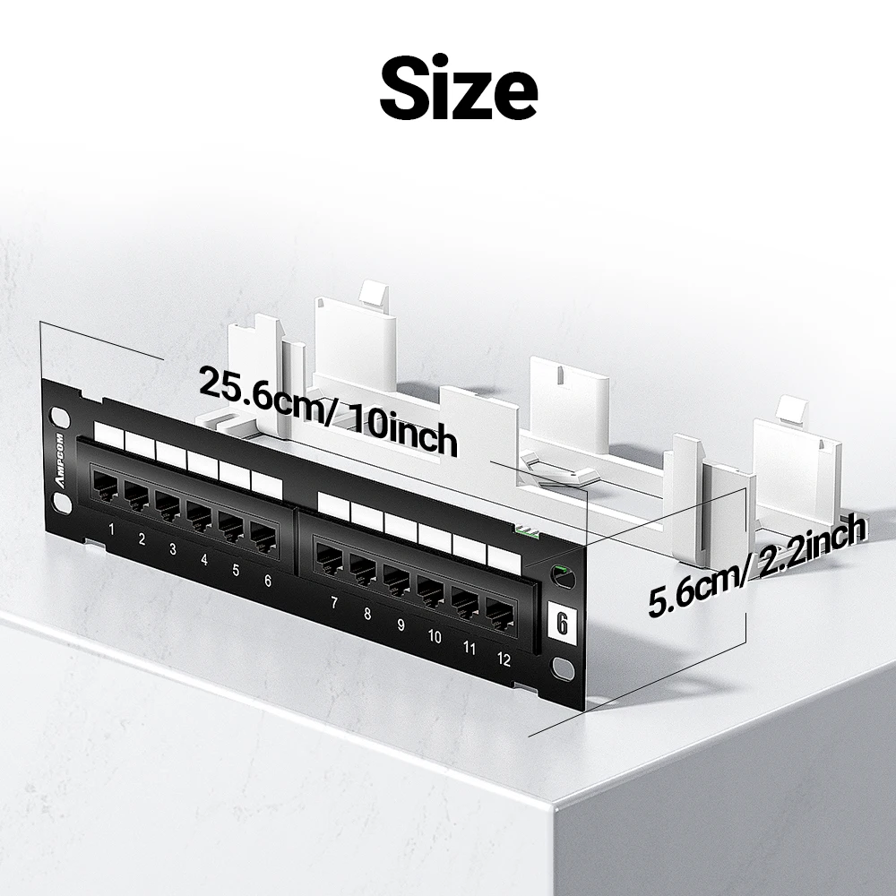 El panel de conexión de montaje en pared sin blindaje Cat6/6 de 12 puertos de AMPCOM con soporte 89D incluido, proporciona una conexión de 250MHz a 12 puertos Ethernet Gigabit 2. 2. Este panel de conexión de montaje en pared Cat6/ 6a de 10 pulgadas es adecuado para aplicaciones domésticas o SMB. Control de desorden de cables con soportes de paso de cable extraíbles incluidos y bridas para cables. Una superficie de escritura sobre cada puerto permite a los usuarios etiquetar las conexiones respectivas. Este panel de conexión compacto/Mini también incluye un soporte de montaje en pared 89D para instalaciones verticales u horizontales. El diseño del soporte de montaje en pared estilo snap-in proporciona un acceso rápido y fácil a las conexiones de cable cuando sea necesario para la instalación o la solución de problemas.