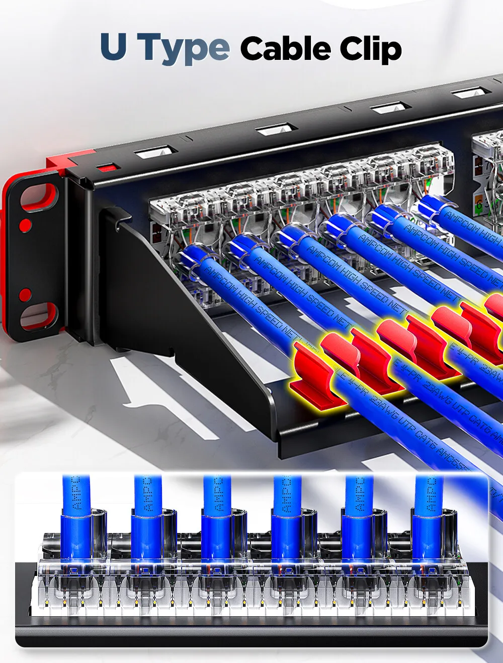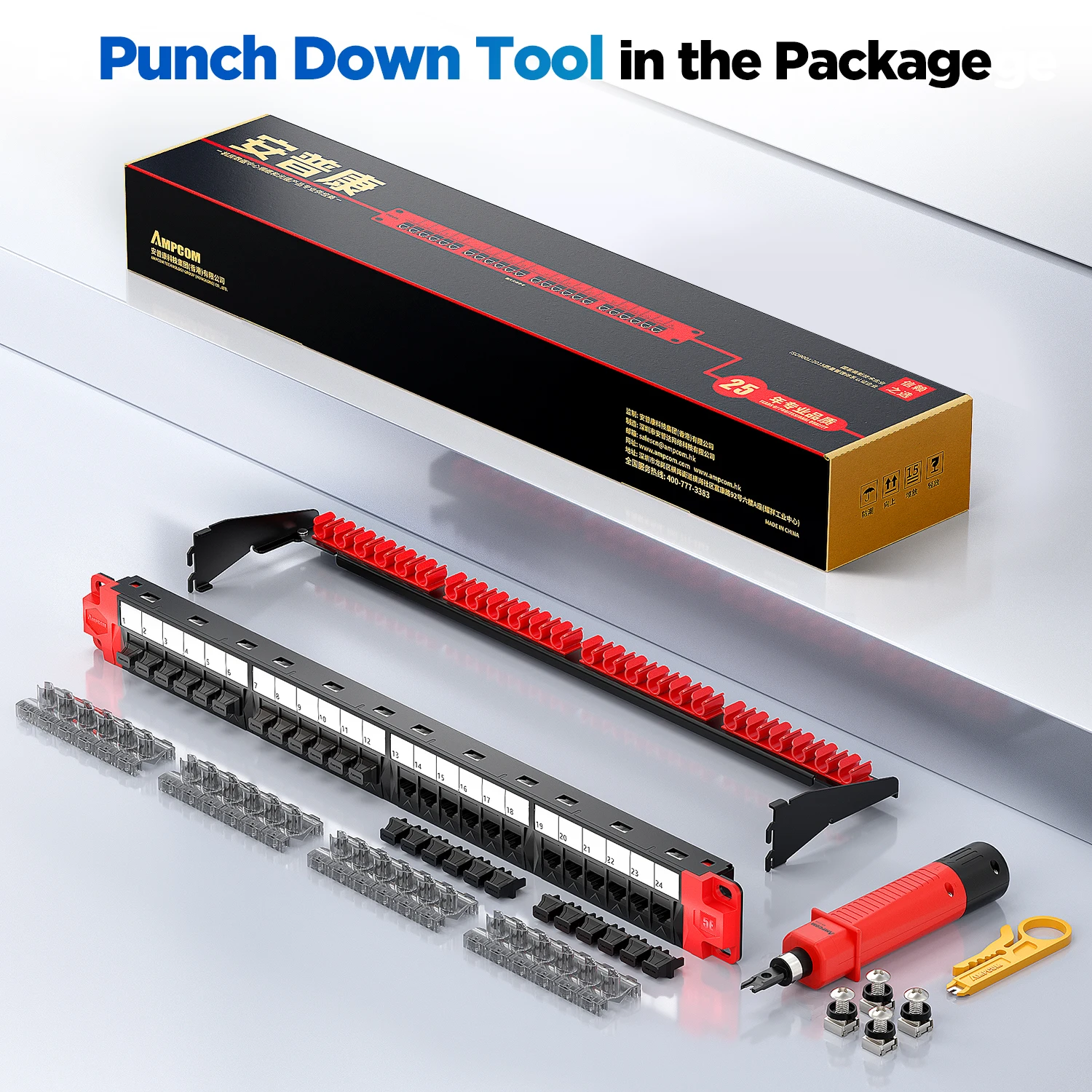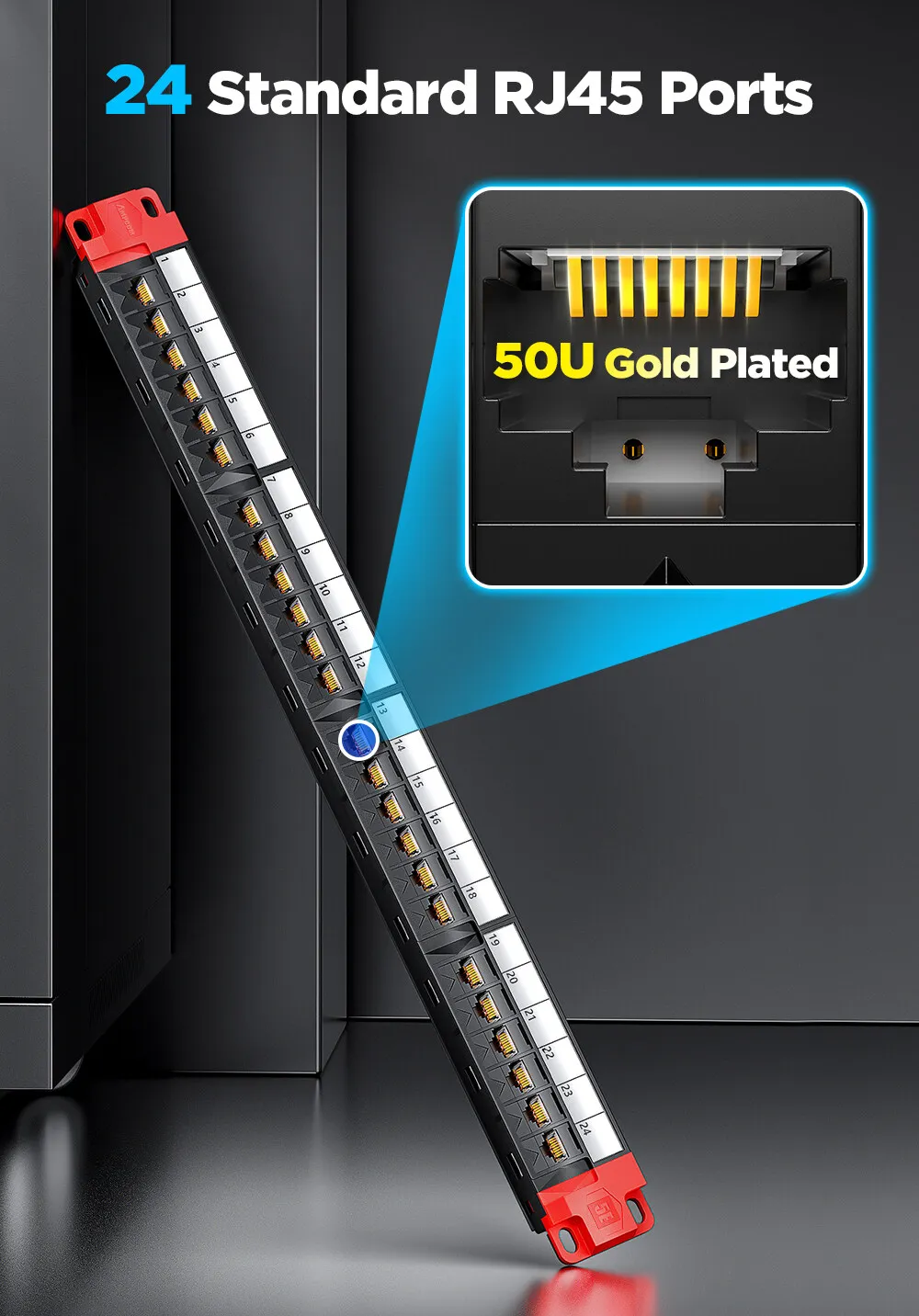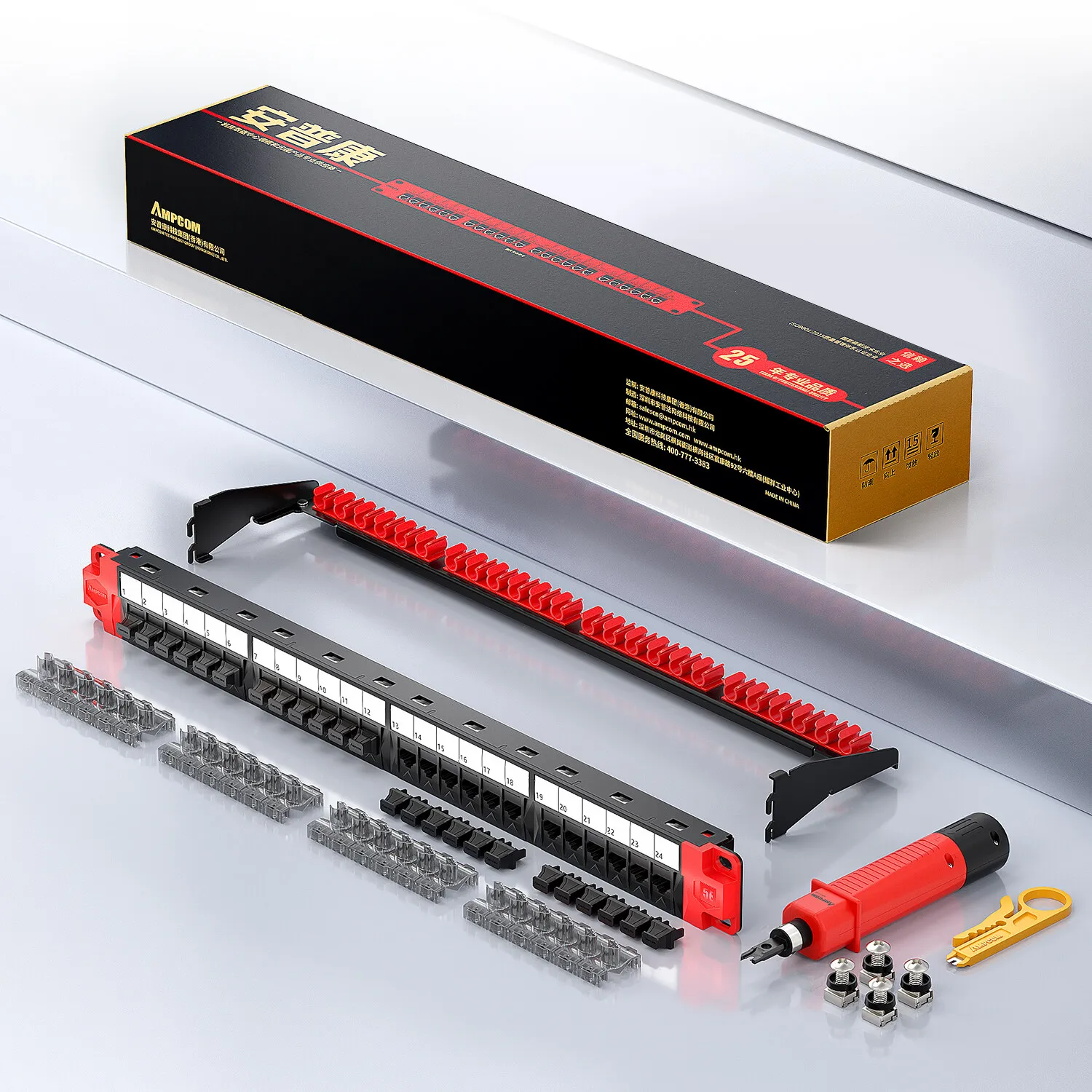 Comprar Panel de conexión UTP serie Industrial AMPCOM CAT5e de 24 puertos y 19 ", contactos jack chapados en oro de 50U con inserciones a prueba de polvo y Mini pelador