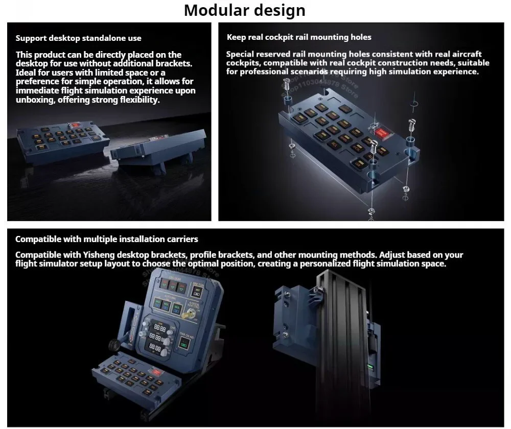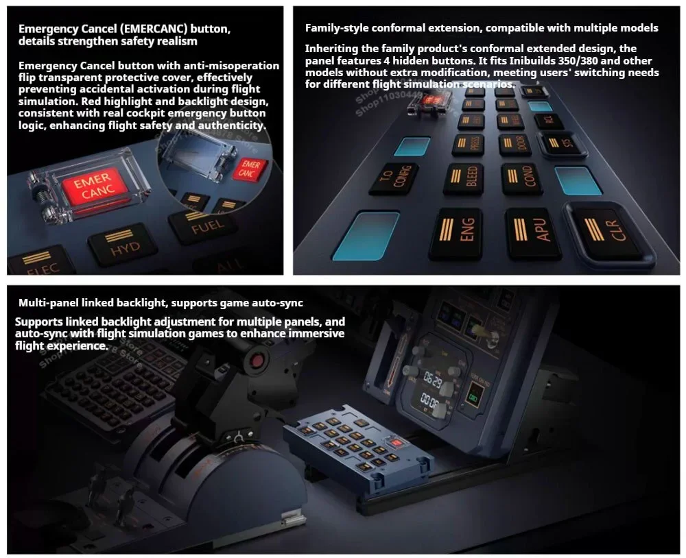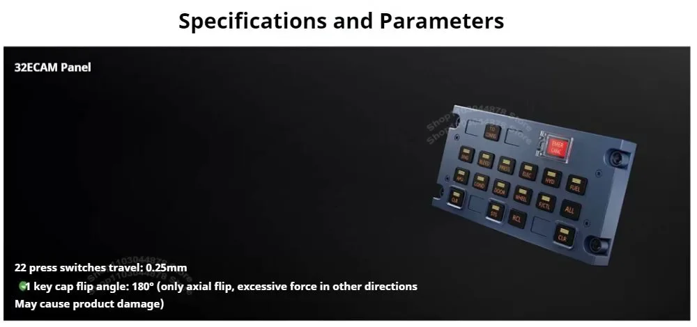 32 Panel ECAM: Cobertura total de múltiples botones de función del sistema. Equipado con 4 botones ocultos, puede adaptarse a diferentes escenarios de vuelo sin modificaciones. La retroiluminación del botón restaura el efecto visual de la cabina y se puede combinar con MCDU, 32 AGP Metal y otros paneles para lograr un enlace fotosensible realista a través de SimAppPro.
