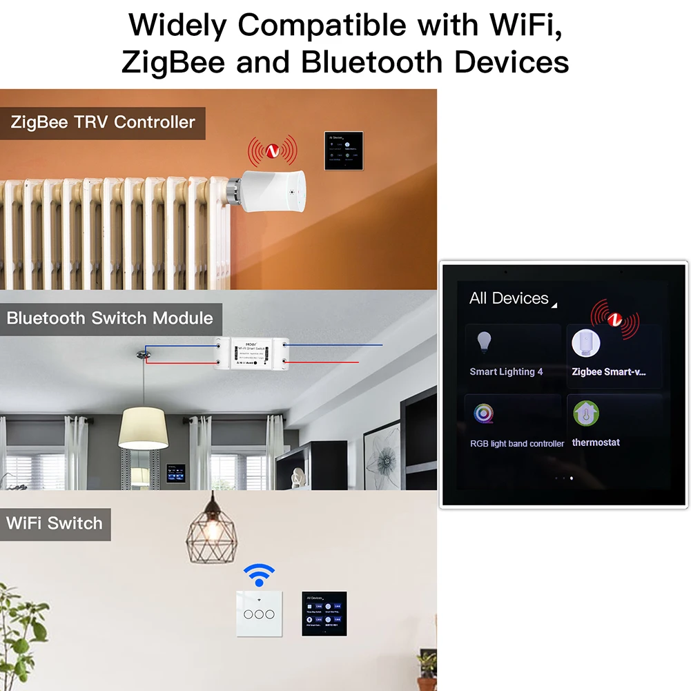Panel táctil central inteligente Tuya, interruptor de pantalla LCD HD de 4 pulgadas, Control multifuncional, Wifi, Zigbee, compatible con Bluetooth para escenas inteligentes Característica: 1. Potente dispositivo de control central:Un dispositivo de control central extremadamente potente para todos los dispositivos inteligentes Tuya y escenas inteligentes que tienen automatización inteligente en la aplicación Smart Life, que se explica como la función de puerta de enlace ZigBee y el control remoto de la aplicación. 2. Ampliamente compatible:Ampliamente compatible con luces, cortinas, aires acondicionados y todos los demás Dispositivos Domésticos inteligentes para el control central. Configure escenas de Smart Home EN LA APP, active el modo de escena con un solo toque en la pantalla. No se requiere más tiempo para abrir la APP para encontrar un dispositivo específico para activar entre tantos. LCD HD de 3,4 pulgadas, IPS:Diseño de pantalla multitáctil, junto con sensor de luz automático, que se adapta bien al estilo de vida inteligente moderno, el diseño en la pared es compatible con las cajas de pared estándar europeas para una instalación simple en segundos. 4. Multifunción:Un buen sustituto de otra puerta de enlace Tuya ZigBee en casa, y use directamente el panel de control como una puerta de enlace para agregar dispositivos Tuya ZigBee en la aplicación para controles inteligentes, hasta 100 + subdispositivos ZigBee disponibles para ser añadidos. 5. Idioma y región opcionales en la configuración del dispositivo:Así como reloj funcional con visualización de hora y fecha, incluso puede verificar el clima en tiempo real para una mejor experiencia de vida Especificación: Certificación: CE Origen: China continental Número de modelo: Panel de control Potencia de entrada: 100-240VAC, 50/60Hz Temperatura de funcionamiento: 0 ℃ -+ 40 ℃ Humedad de funcionamiento: 5% - 90% RH (sin condensación) Protocolos inalámbricos: WiFi, compatible con Bluetooth, ZigBee Tamaño: 86*86*36mm/3,4*3,4*1.4in Nota: