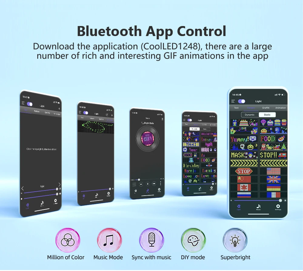 La señal LED está controlada por una aplicación conectada por Bluetooth, que admite la conexión de múltiples pantallas LED al mismo tiempo, lo que hace que su tienda sea más llamativa, la aplicación tiene incorporados muchos modos y animaciones interesantes. Su teléfono facilita la personalización de patrones y texto divertidos para personalizar su tienda.