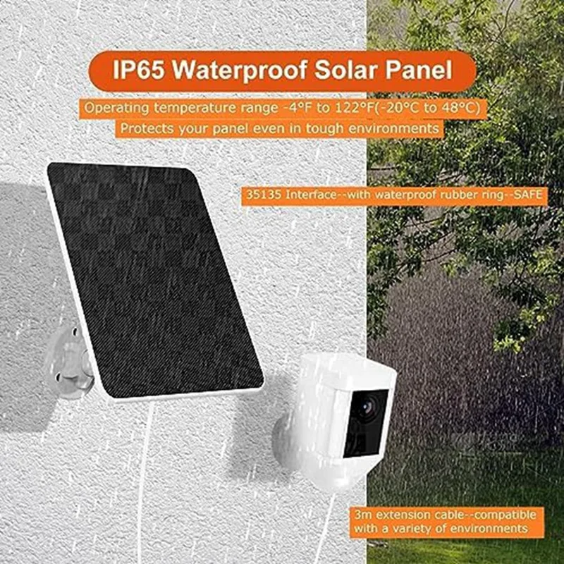 La potencia del panel solar de 6W puede alcanzar más de 5V 1A de corriente bajo la luz solar. La eficiencia de conversión de energía es de hasta 20%. Solo se necesitan unas pocas horas a la luz del sol para cargar completamente la batería de la Cámara Ring rápidamente. Incluso en clima nublado y frío, puede absorber la luz solar y convertirla en electricidad para que su cámara funcione correctamente. El IC inteligente incorporado proporciona protección contra sobrecarga, sobrecalentamiento, sobretensión y cortocircuito, su dispositivo estará completamente protegido mientras se carga.