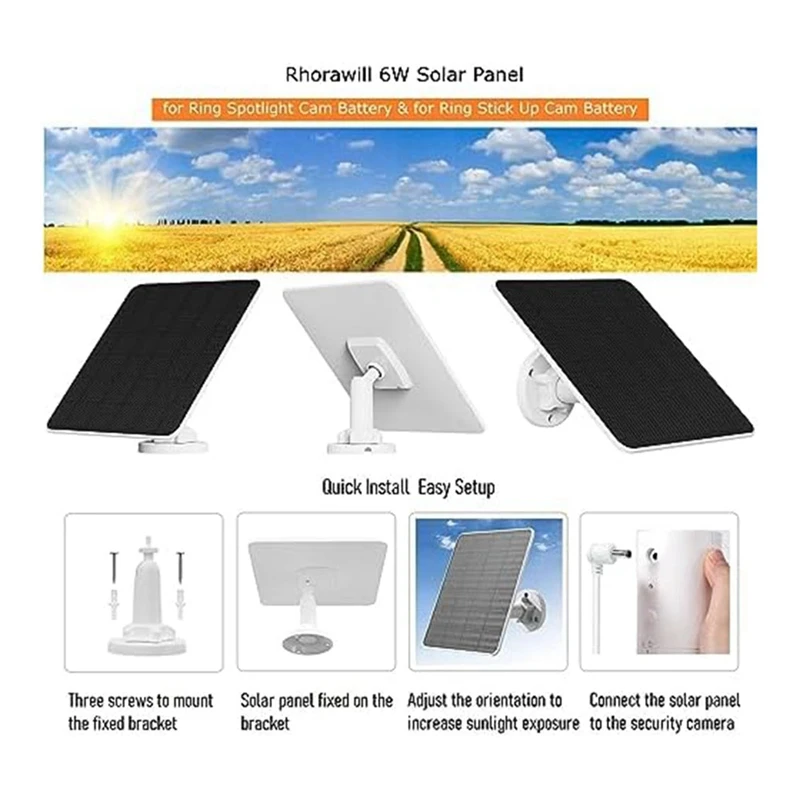 Puede instalar el panel solar de 6W en cualquier lugar al aire libre, simplemente perforar agujeros en la pared, instalar el soporte de pared giratorio de 360 °, mirar hacia el panel solar hacia la luz solar directa, Y luego conecte el cable de carga de 9,8 pies (3 metros) al puerto de carga de CC de 3,5mm de la batería de la Cámara Ring. Esto le brinda la flexibilidad de elegir el ángulo óptimo y obtener mucha luz solar sin tener que cargar constantemente la batería de su cámara Ring.