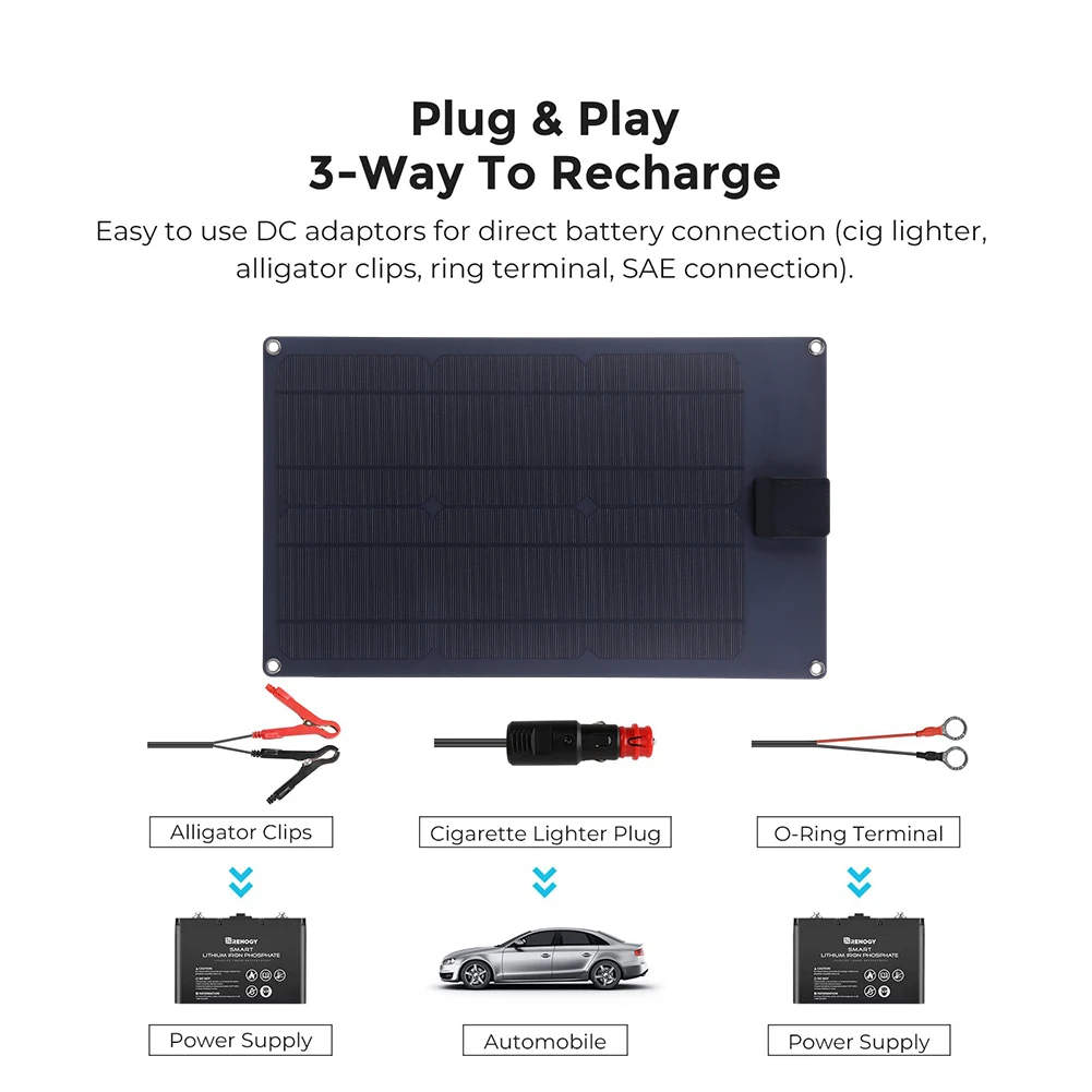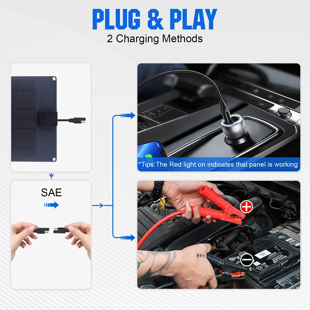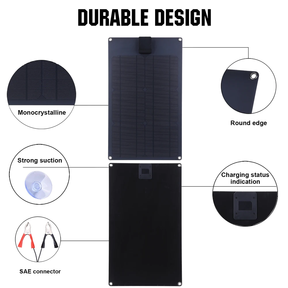 4. Amplia aplicabilidad:Este cargador de batería de panel solar viene con todos los accesorios necesarios, incluyendo pinzas de cocodrilo, cargador de coche, ventosas, ganchos y un cable de CC. Puede cargar varios dispositivos, como teléfonos de 5-12V, bancos de energía, baterías de automóviles, pequeños electrodomésticos, luces de emergencia, señalización publicitaria, semáforos, lámparas domésticas, ventiladores, bombas de agua Solares, farolas solares y pequeños sistemas solares. Su versatilidad lo hace adecuado para múltiples aplicaciones.