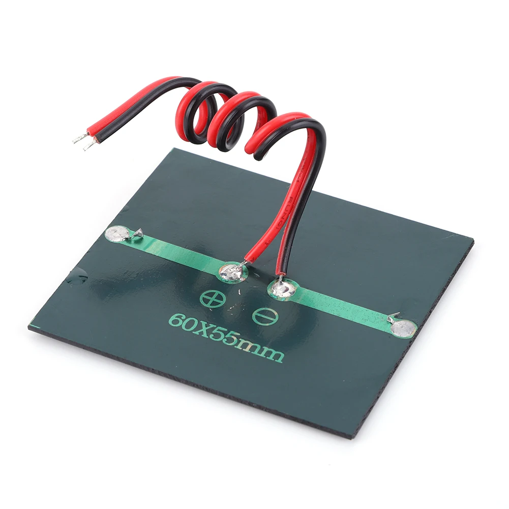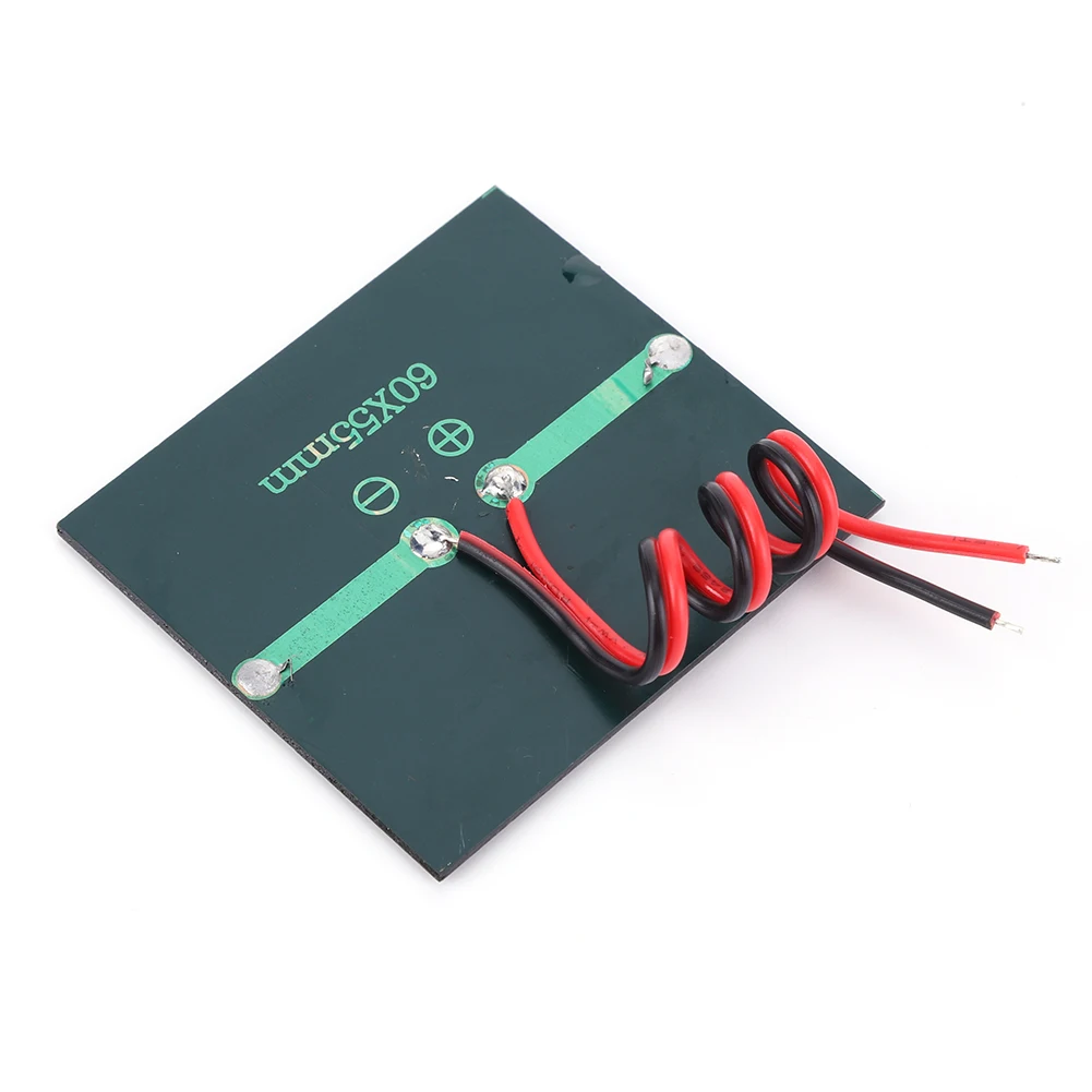1. Durable Quality with Compact Design: The small solar panel is constructed from high-quality polycrystalline silicon, featuring a laminated process that ensures reliability and durability, capable of withstanding wind and snow. Despite its compact size of 60x55mm, this solar panel is robustly designed for compatibility with numerous applications, offering a blend of portability and long-lasting performance.