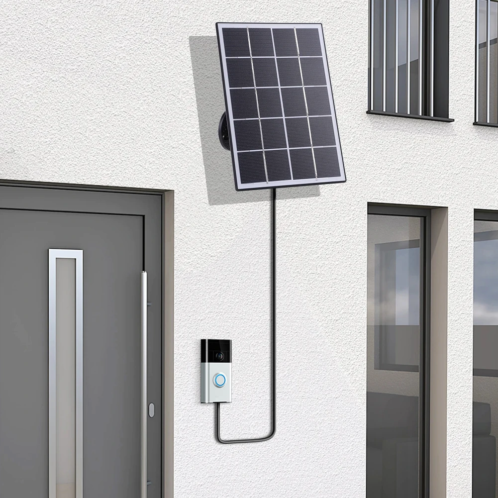 4.IP65 resistente al agua: TEl kit de paneles solares presenta una superficie hecha de silicio monocristalino y es resistente al agua IP65, a la lluvia y a la nieve, lo que lo hace adecuado para uso en exteriores.Elimina la molestia de quitar con frecuencia la batería del timbre para cargarlo.Puede soportar condiciones climáticas adversas, es fácil de limpiar y duradero.El rango de temperatura de trabajo es -4°F a 122°F. El conector del cable de carga viene con un conector en forma de horquilla para una fácil conexión a los dos puertos en la parte posterior de la batería del timbre con video.(Tenga en cuenta la protección impermeable del puerto del cargador)