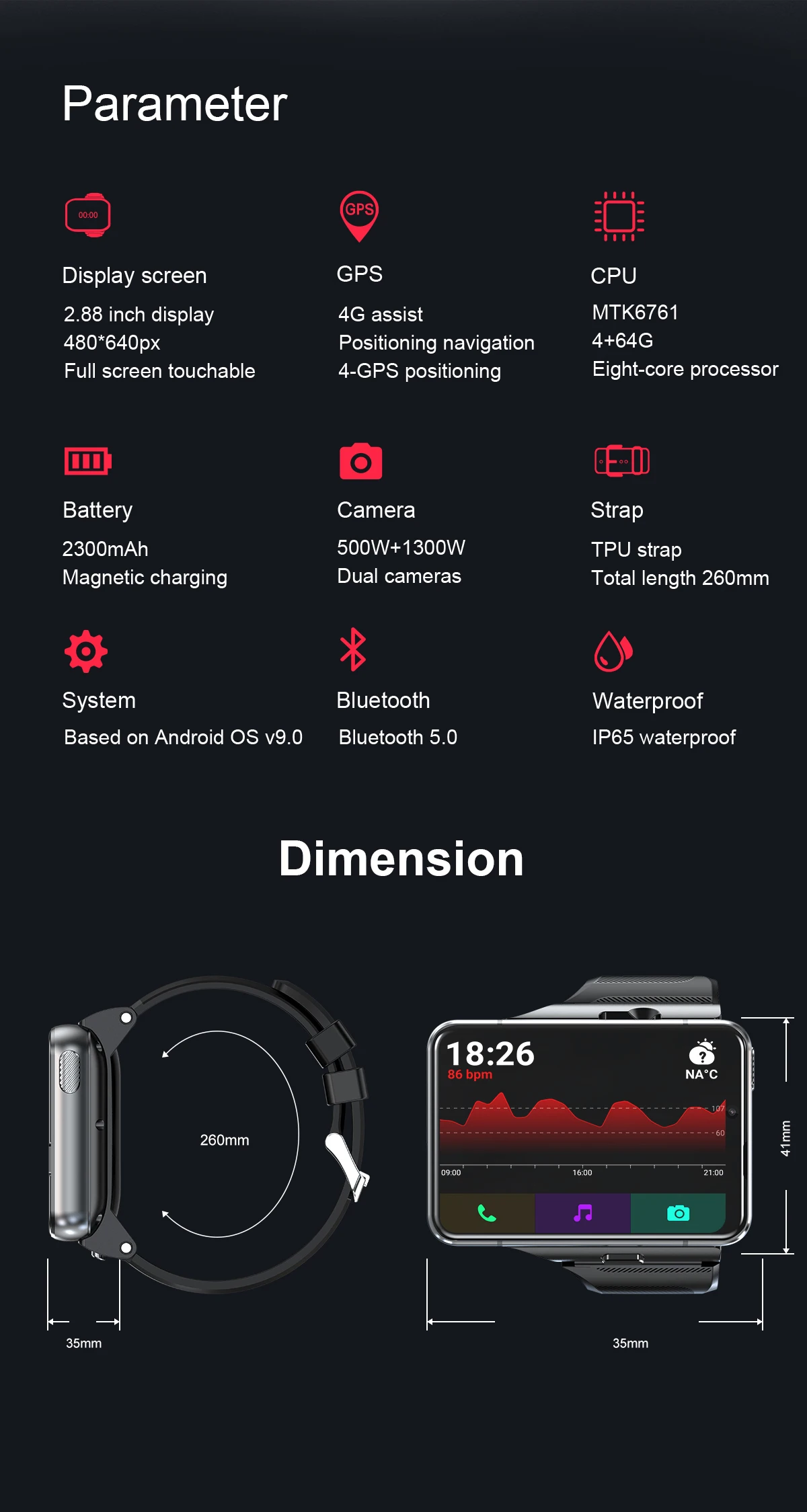 Pantalla grande de 2,88 pulgadas cámaras HD duales Android GPS WHATSAPP YOUTUBE FACEBOOK WIFI videollamada 4G hombres reloj inteligente con tarjeta SIM