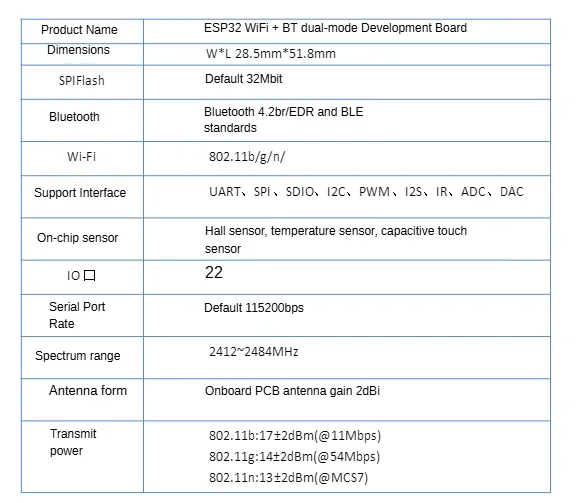 El módulo es la placa de desarrollo de ESP-WROOM-32, y las características de los parámetros de ESP-WROOM-32 también son las características de los parámetros del módulo.
