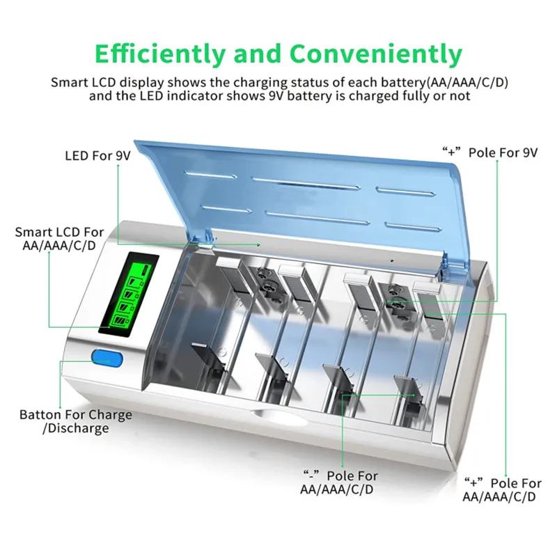 Comprar Pantalla inteligente LCD de 6 ranuras, cargador de batería con enchufe UE/EE. UU. de carga rápida para batería recargable de 1,2 V AAA AA C D tamaño 9V