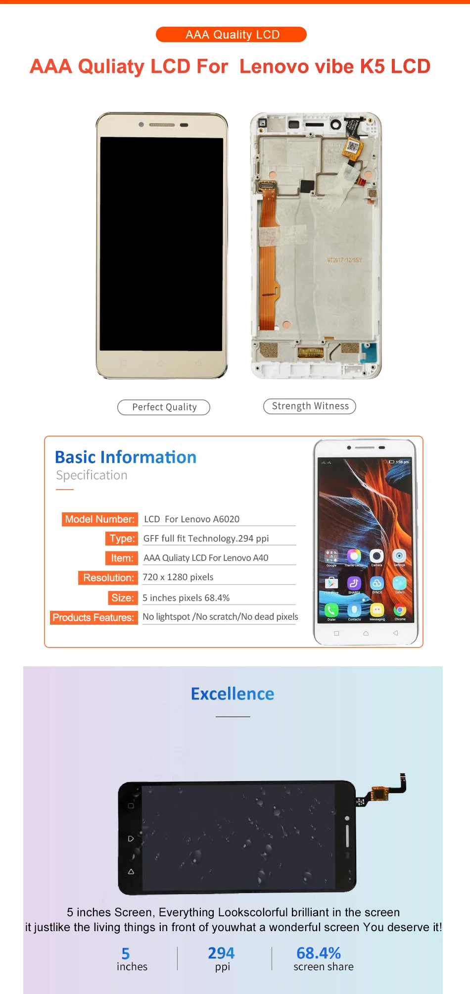 LCD de calidad AAA para Lenovo VIBE K5 A6020 A40 pantalla LCD MONTAJE DE digitalizador de Panel táctil con piezas de repuesto de Marco