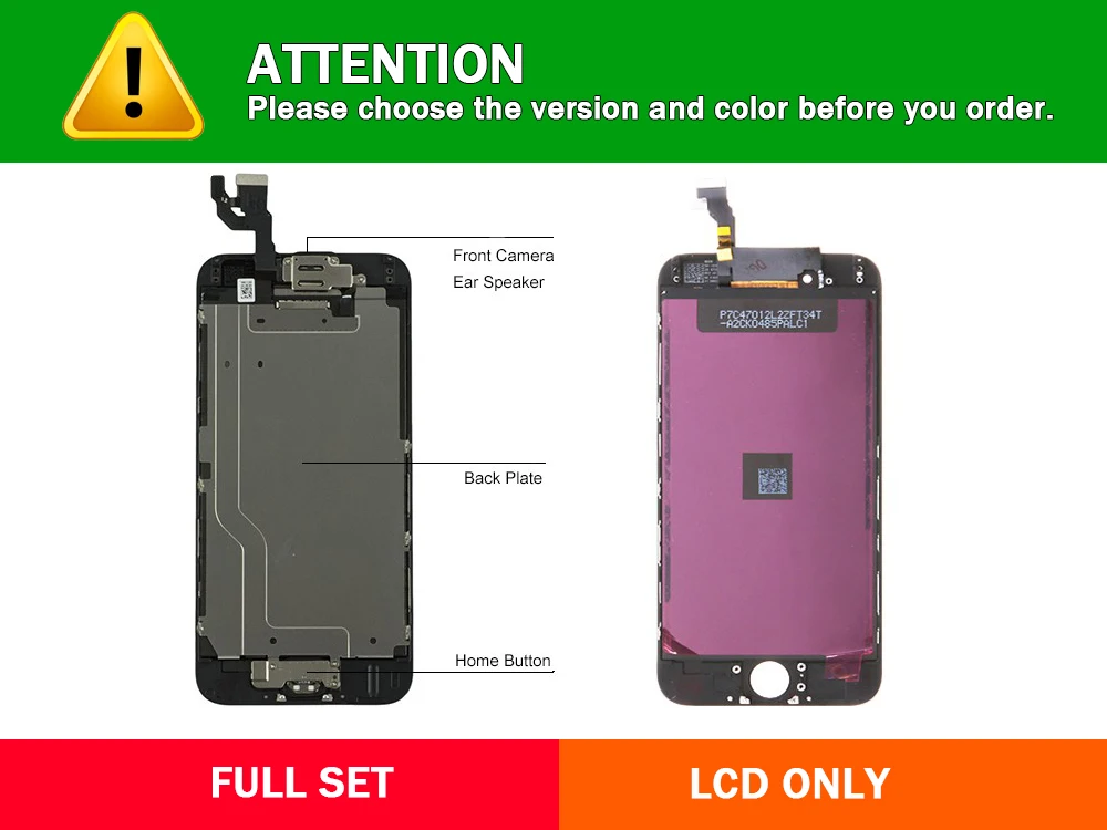 Puede elegir "Solo LCD", no incluye la cámara frontal ni el botón de inicio, luego debe quitar las partes pequeñas de su pantalla antigua a la nueva pantalla, pero también tenga cuidado, el LCD es frágil;