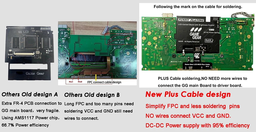 2.Utilice el cable Plus para conectar la placa del controlador y la placa base GameGear, sin líneas de mosca complicadas, ingeniería de película de cubierta negra de alta calidad, VCC, GND no están conectados.