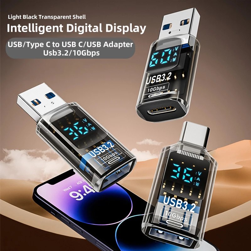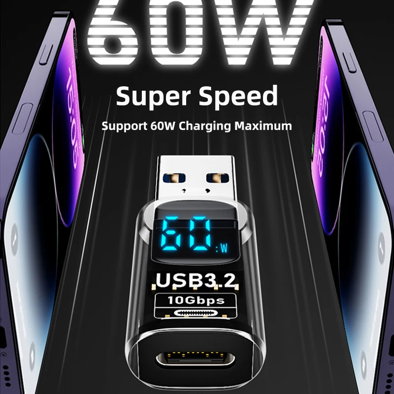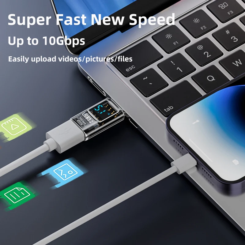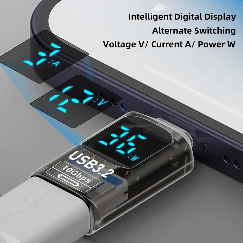36W 60W Digital LED Display USB to USB C OTG Adapter Type C to USB3.2 Data Transfer Fast Charging Converter Power Meter Tester