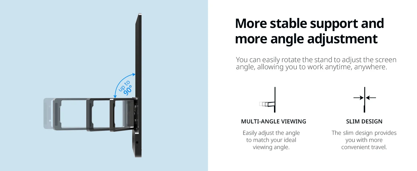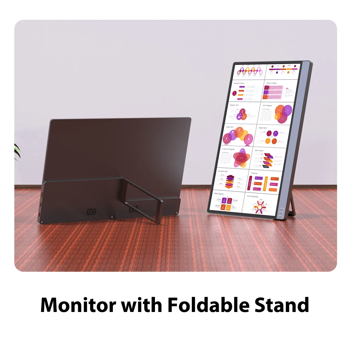 ▪[Con soporte plegable]Hay un diseño de soporte integrado en la parte posterior del monitor, lo que significa que puede usar el monitor inmediatamente en cualquier lugar cuando abra el soporte, sin necesidad de montar un soporte adicional.