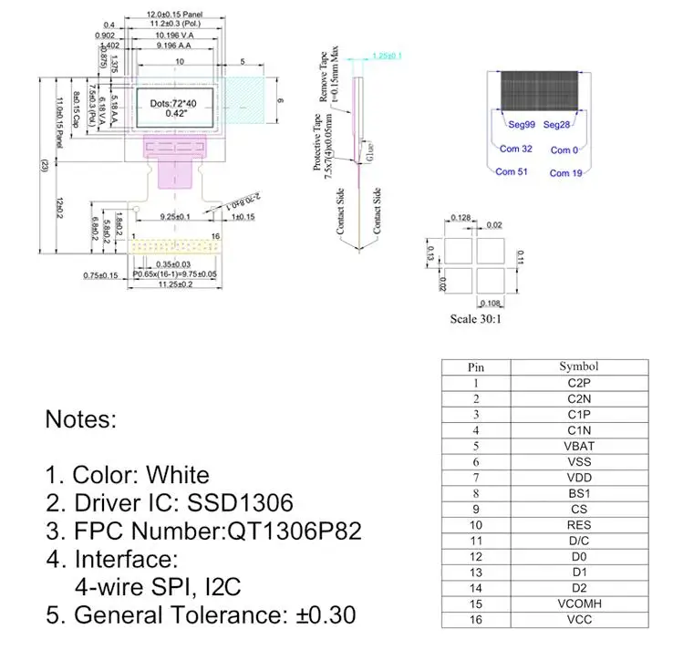 Voltaje de funcionamiento: 3,3 VResolución: 128*32Chip controlador: SSD1306Pasador