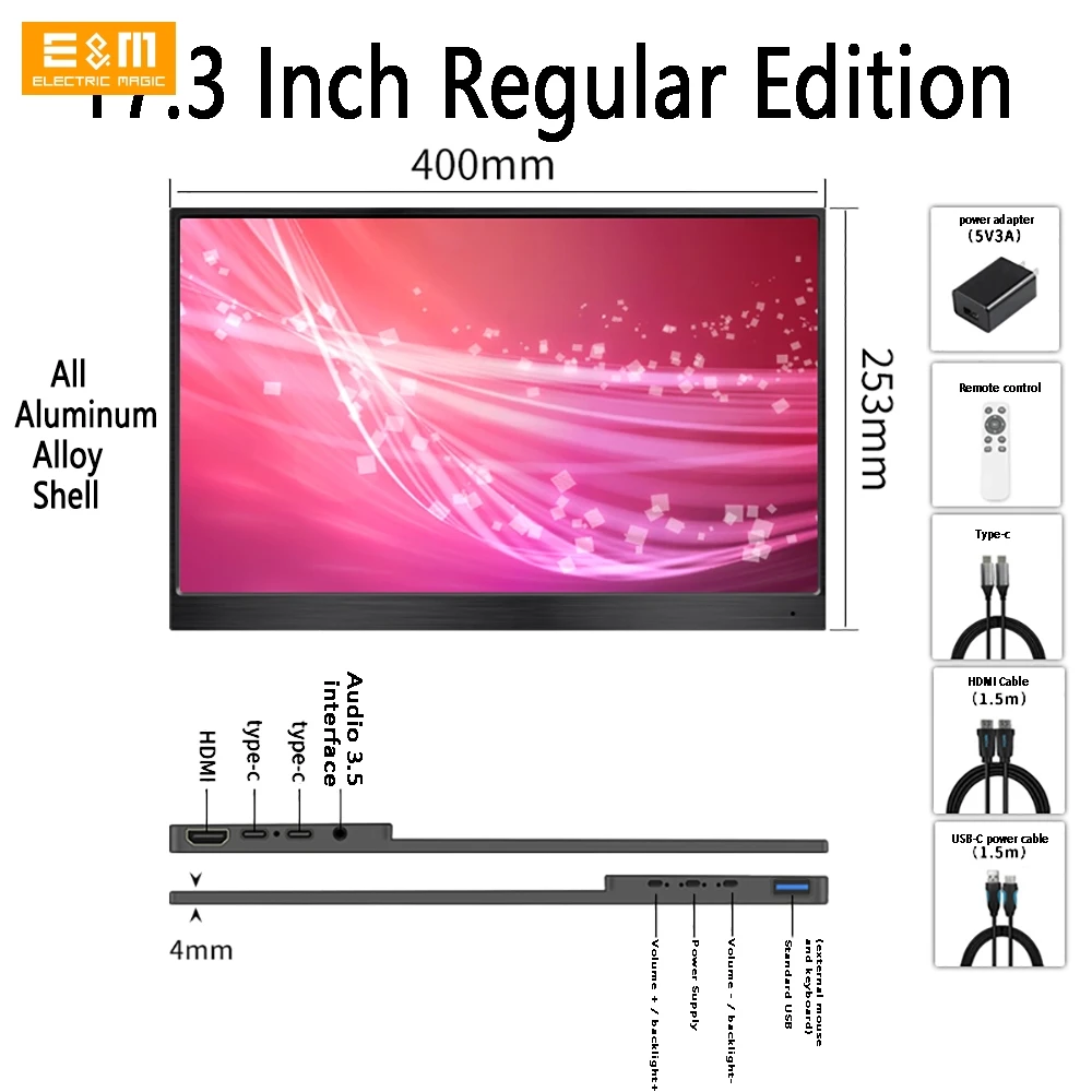 El paquete incluye:✻✻✻✻Parámetros detallados del producto: Tipo de producto resolución de pantalla portátil: 1920' 1080p Tiempo de respuesta: 3ms Gama de colores: 72% NTSC Tamaño del producto: 17,3 pulgadas Tipo de pantalla: IPSFrecuencia de actualización: 60HZ Relación de pantalla: 16:9 Altavoz incorporado: sonido estéreo dualBrillo: cd/m2 Toque de diez puntos: Versión táctil (compatible) versión normal (no compatible). Peso/grosor: 1100g/4mm (versión táctil) 900g/4mm (versión normal)Base (opcional): soporte/funda magnética