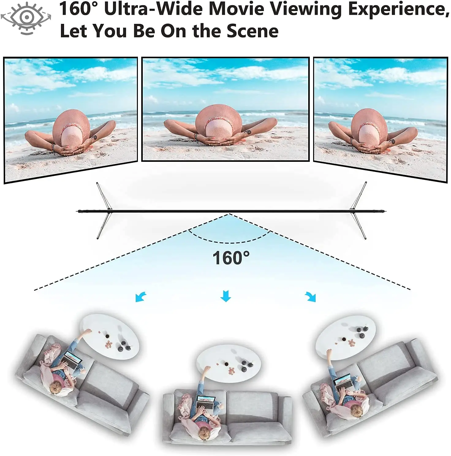 Pantalla de cine portátil de 100 o 120 pulgadas con soporte, ángulo de visión amplio de 160 grados, relación de pantalla de 16:9, alta reducción de color, proyección 4K ultra HD, que proporciona imágenes muy claras en diferentes posiciones de visualización, le ofrece una impresionante experiencia visual de cine en casa.