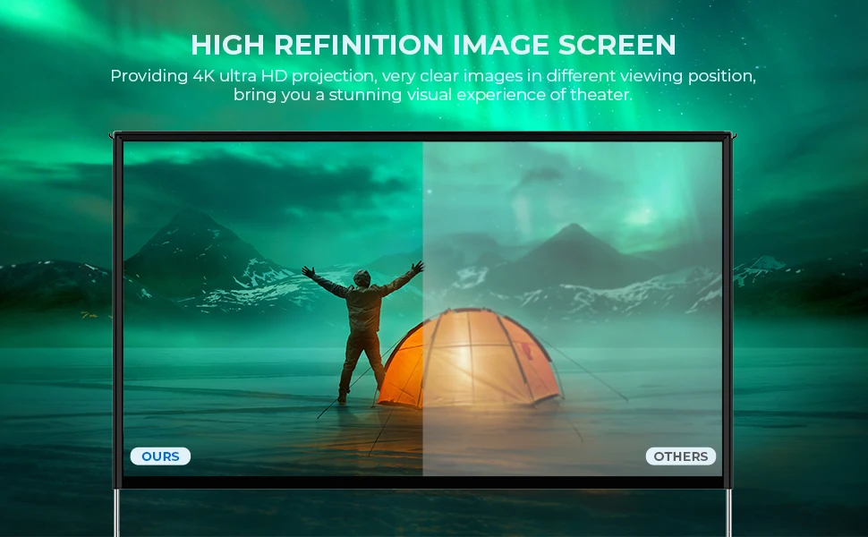 La pantalla del proyector para exteriores con materiales de poliéster de alta calidad, es flexible, segura y suave, sin rastros y sin arrugas después de doblarla, puede proporcionar colores más brillantes e imágenes más claras. Esta tela no se deformará después del lavado, fácil de limpiar.