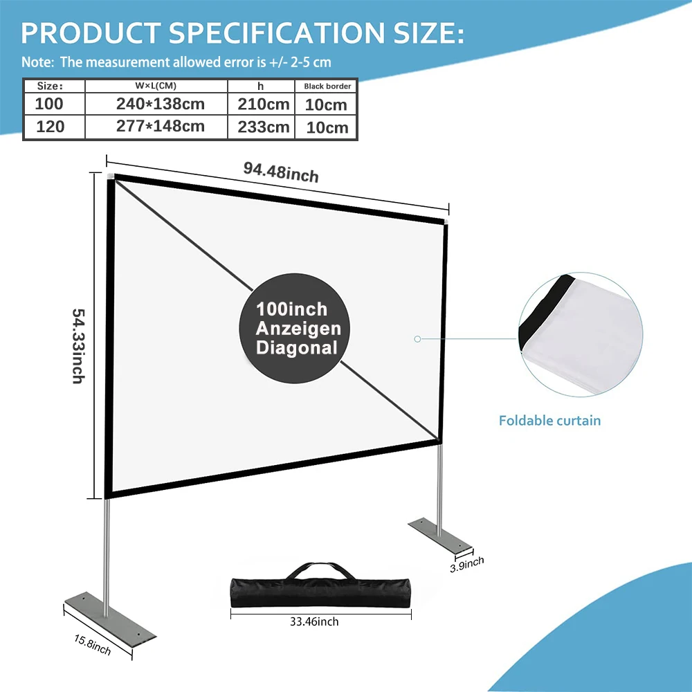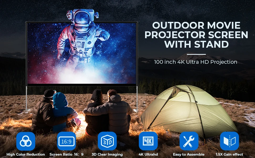 Comprar Pantalla de proyector portátil con soporte para exteriores, pantalla de proyección de vídeo de película de 100 pulgadas, tela de 120 pulgadas, 2K, 4K, HD, 100, 120 pulgadas