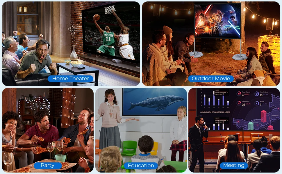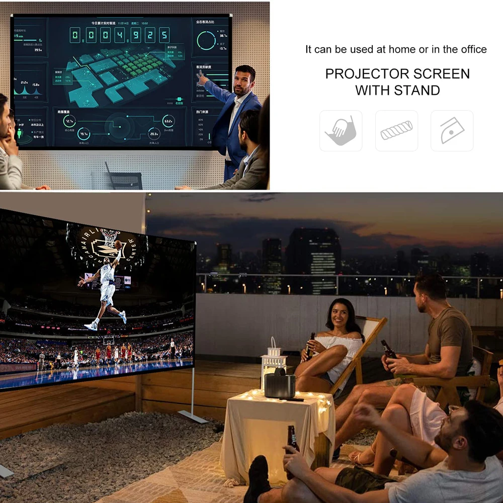 La pantalla del proyector de video es ajustable, por lo que es adecuada para la oficina, películas en el patio trasero, cine en casa, centros de actividades comerciales a gran escala o pequeños autocines. Especialmente para actividades al aire libre, le ayudará a lograr más ideas y disfrutar de una noche maravillosa durante el campamento.